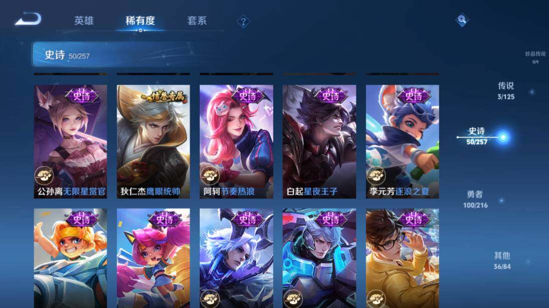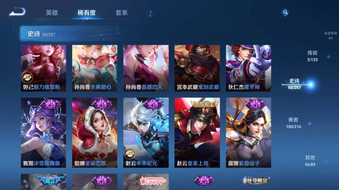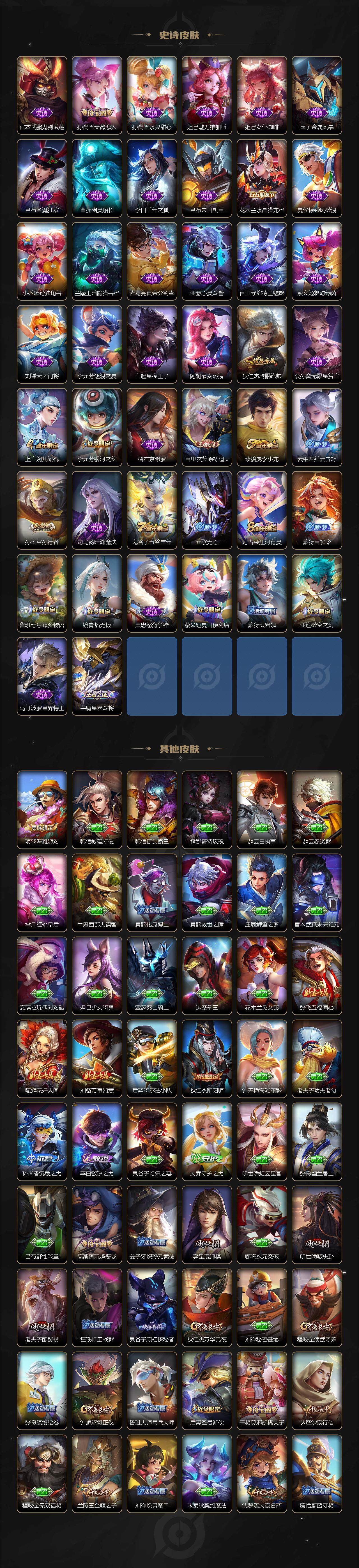 【史诗皮肤】:露娜紫霞仙子,赵云皇家上将,赵云未来纪元,貂蝉圣诞恋歌,甄姬冰雪圆舞曲,狄仁杰魔术师,宫本武藏鬼剑武藏,孙尚香蔷薇恋人,孙尚香水果甜心,妲己魅力维加斯,妲己女仆咖啡,墨子金属风暴,吕布圣诞狂欢,曹操幽灵船长,李白千年之狐,吕布末日机甲,花木兰水晶猎龙者,夏侯惇乘风破浪,小乔缤纷独角兽,兰陵王暗隐猎兽者,诸葛亮黄金分割率,亚瑟心灵战警,百里守约特工魅影,蔡文姬舞动绿茵,刘禅天才门将,李元芳逐浪之夏,白起星夜王子,阿轲节奏热浪,狄仁杰鹰眼统帅,公孙离无限星赏官,上官婉儿梁祝,李元芳银河之约,橘右京修罗,百里玄策原初追逐者,裴擒虎