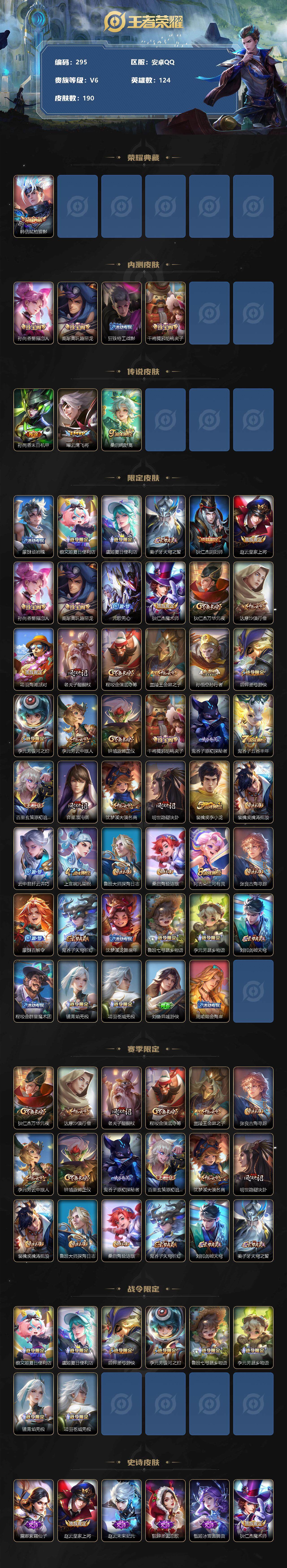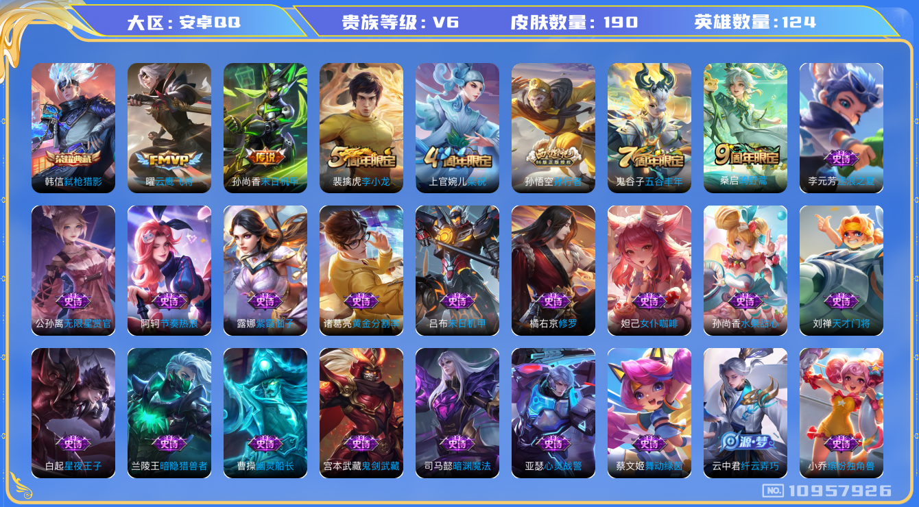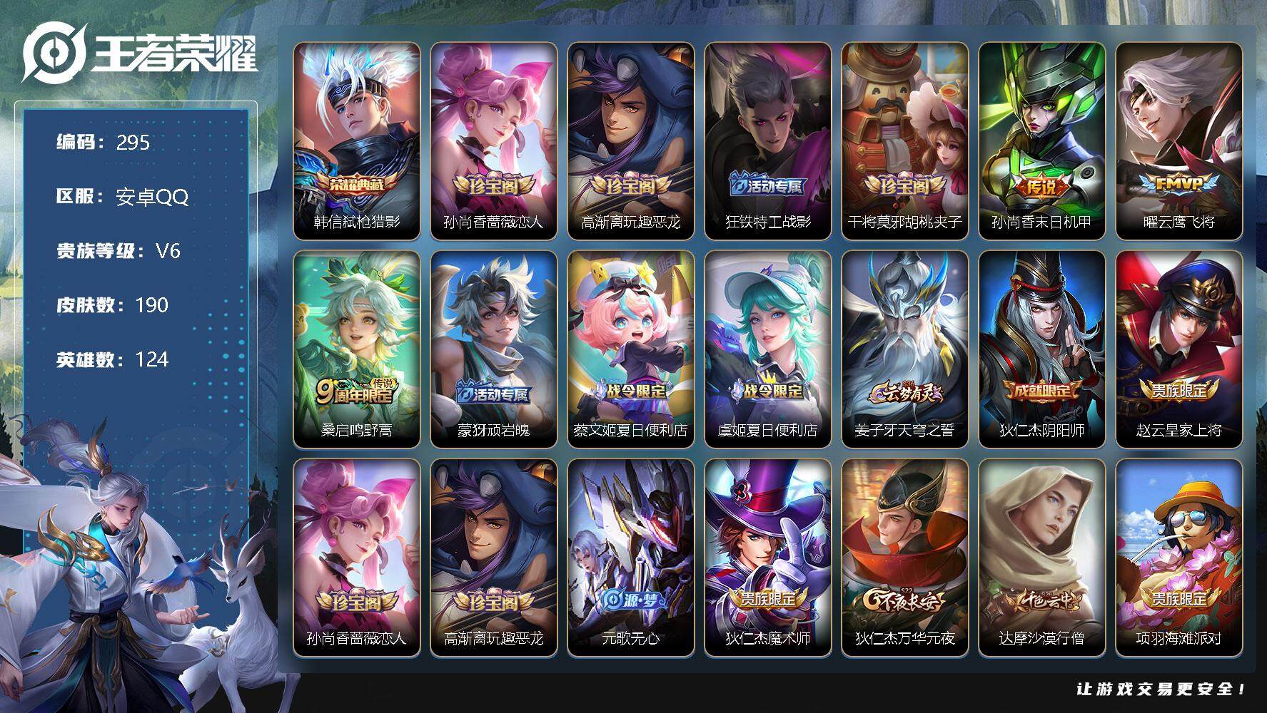 [10957926]【商品标题】:安卓Q-V6-最强王者段位-124英雄-190皮肤-1典藏-0珍品无双-0无双-0珍品传说-3传说-50史诗