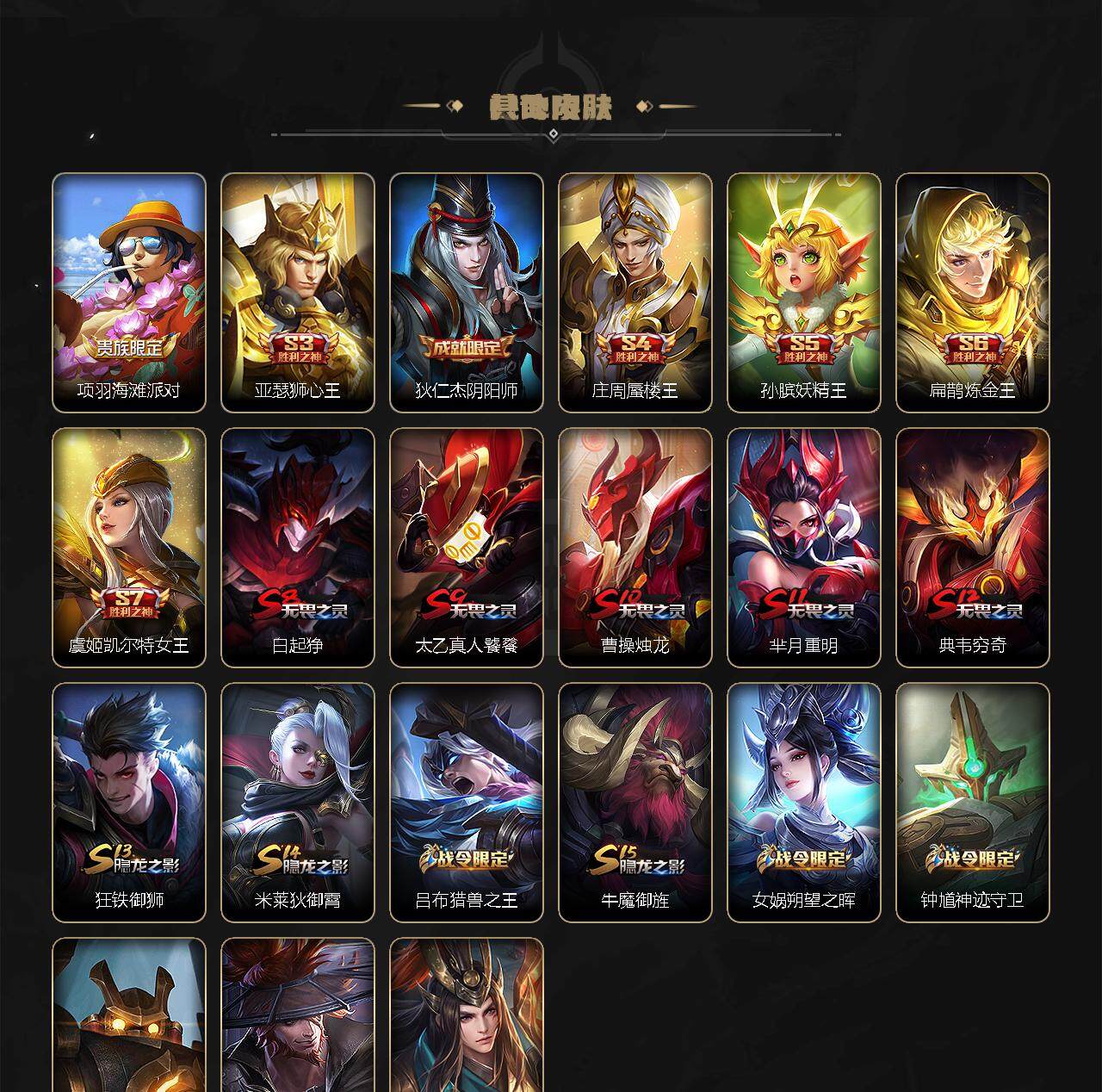 【赛季限定】:庄周蜃楼王,孙膑妖精王,扁鹊炼金王,白起狰,芈月重明,夏侯惇朔风刀,曹操烛龙,典韦穷奇,狄仁杰万华元夜,达摩沙漠行僧,老夫子醍醐杖,程咬金演武夺筹,兰陵王金庭之子,亚瑟狮心王,牛魔御旌,虞姬凯尔特女王,钟馗驱傩正仪,太乙真人饕餮,鬼谷子原初探秘者,弈星混沌棋,明世隐疑决卦,狂铁御狮,米莱狄御霄,盾山御銮
