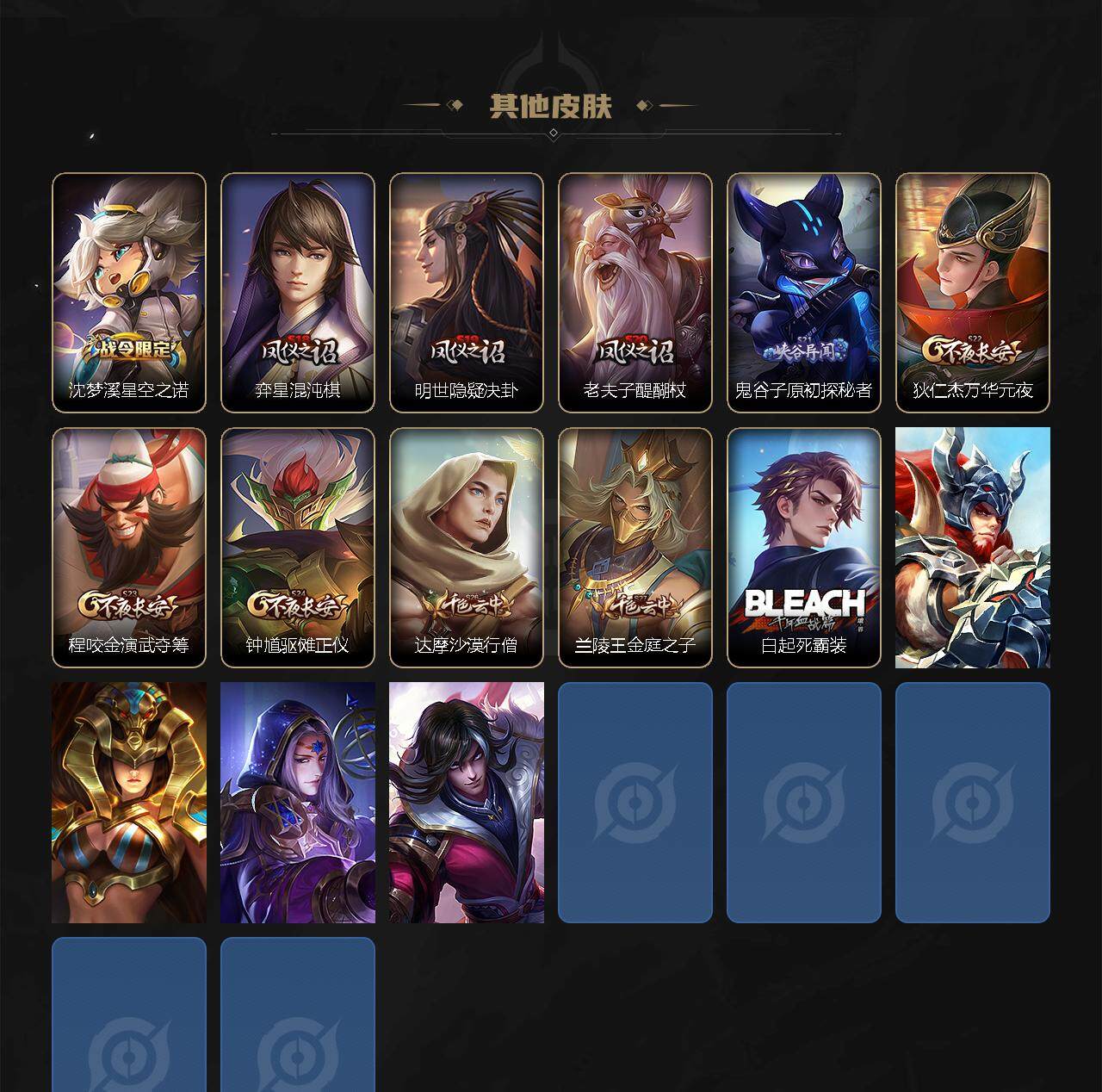 【限定皮肤】:白起狰,狄仁杰阴阳师,虞姬凯尔特女王,赵云皇家上将,妲己时之彼端,嬴政白昼王子,鲁班七号狮舞东方,庄周蜃楼王,孙膑妖精王,扁鹊炼金王,芈月重明,吕布猎兽之王,周瑜赤莲之焰,夏侯惇朔风刀,甄姬幽恒,甄姬游园惊梦,曹操烛龙,典韦穷奇,典韦蓝屏警告,典韦岱宗,狄仁杰魔术师,狄仁杰万华元夜,达摩沙漠行僧,项羽海滩派对,老夫子醍醐杖,关羽冰锋战神,程咬金演武夺筹,韩信逐梦之影,王昭君凤凰于飞,兰陵王金庭之子,亚瑟狮心王,孙悟空大圣娶亲,牛魔御旌,李元芳银河之约,虞姬启明星使,钟馗神迹守卫,钟馗驱傩正仪,杨玉环遇见飞天,女娲朔望之晖,太乙真人饕餮,鬼谷子原初探秘者,铠青龙志,弈星混沌棋,沈梦溪星空之诺,明世隐疑决卦,裴擒虎李小龙,狂铁御狮,米莱狄御霄,云中君纤云弄巧,伽罗太华,盾山御銮,上官婉儿梁祝,嫦娥如梦令