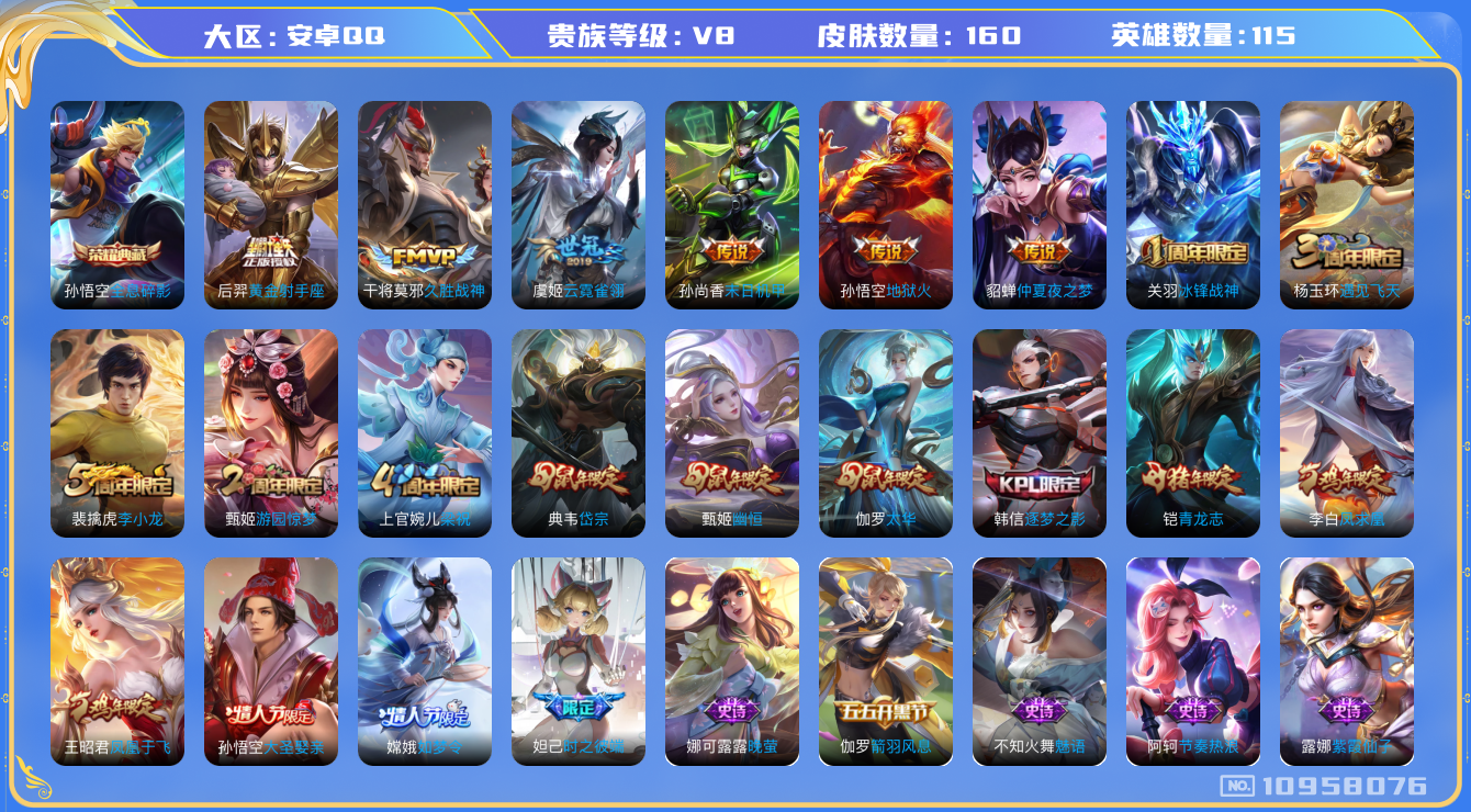 [10958076]【商品标题】:安卓Q-V8-永恒钻石IV段位-115英雄-160皮肤-1典藏-0珍品无双-0无双-0珍品传说-9传说-41史诗