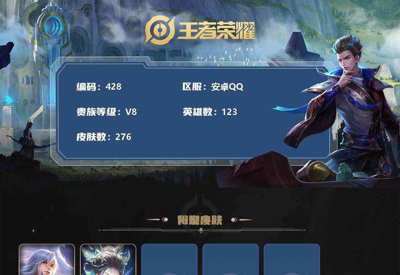 [10958196]【商品标题】:安卓Q-V8-尊贵铂金IV段位-123英雄-276皮肤-1典藏-0珍品无双-0无双-0珍品传说-15传说-64史诗