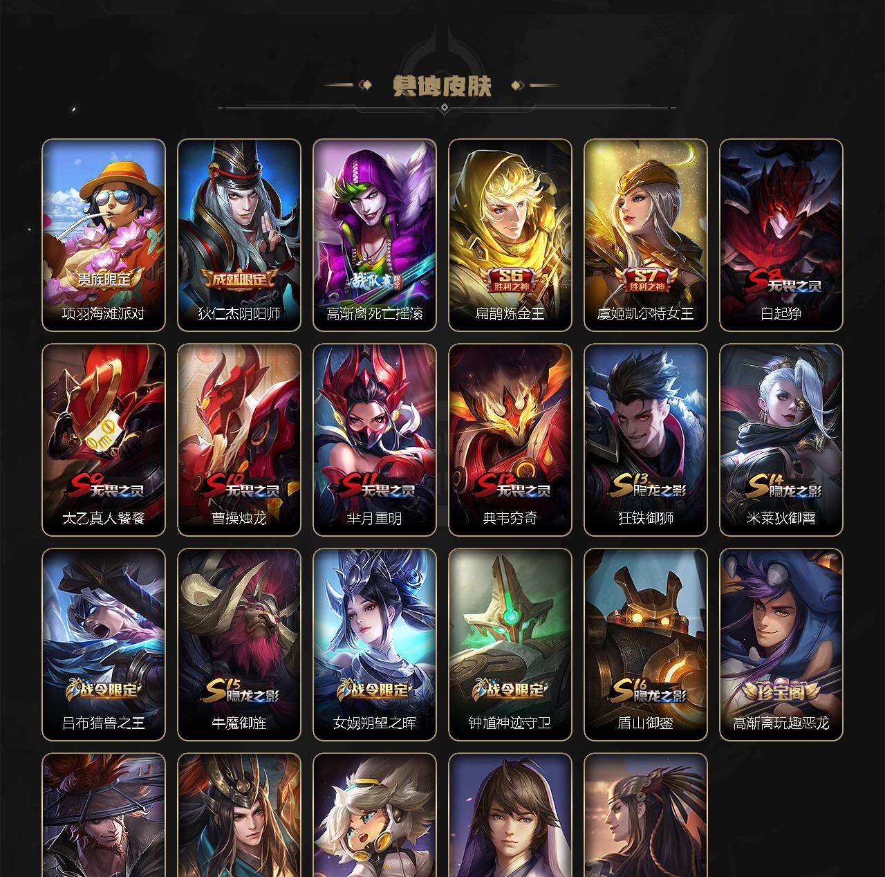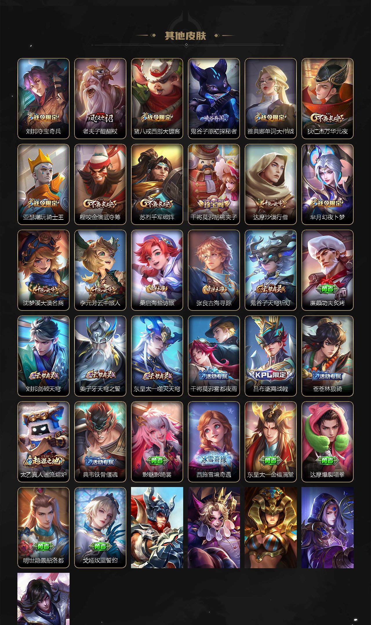 【限定皮肤】:白起狰,姜子牙天穹之誓,狄仁杰阴阳师,虞姬凯尔特女王,廉颇寅虎御盾,赵云皇家上将,嬴政白昼王子,鲁班七号狮舞东方,鲁班七号寅虎瑞焰,庄周高山流水,高渐离死亡摇滚,高渐离玩趣恶龙,阿轲迷踪丽影,孙膑寅虎展翼,扁鹊炼金王,芈月重明,芈月幻夜卜梦,吕布猎兽之王,周瑜赤莲之焰,元歌云间偶戏,夏侯惇朔风刀,甄姬游园惊梦,曹操烛龙,典韦穷奇,典韦蓝屏警告,马可波罗暗影游猎,狄仁杰魔术师,狄仁杰万华元夜,达摩沙漠行僧,项羽海滩派对,老夫子醍醐杖,程咬金演武夺筹,刘邦夺宝奇兵,韩信逐梦之影,韩信傲雪梅枪,兰陵王驯魔猎人,亚瑟潮玩骑士王,牛魔御旌,后羿如梦令,李元芳银河之约,李元芳云中旅人,虞姬启明星使,钟馗神迹守卫,杨玉环遇见飞天,杨玉环寅虎心曲,女娲朔望之晖,女娲补天,干将莫邪胡桃夹子,雅典娜单词大作战,蔡文姬繁星吟游,太乙真人饕餮,东皇太一逐梦之光,鬼谷子原初探秘者,诸葛亮武陵仙君,黄忠火炮绅士,苏烈千军破阵,弈星混沌棋,沈梦溪星空之诺,沈梦溪大漠名商,明世隐疑决卦,裴擒虎李小龙,裴擒虎寅虎赤拳,狂铁御狮,米莱狄御霄,云中君纤云弄巧,云中君时之祈愿,盾山御銮,猪八戒西部大镖客,猪八戒猪悟能,上官婉儿梁祝,嫦娥拒霜思,蒙犽狂想玩偶喵,桑启海盐诗旅,阿古朵江河有灵,张良古海寻踪,鬼谷子天穹祈灯,刘邦剑破天穹,程咬金群星魔术团