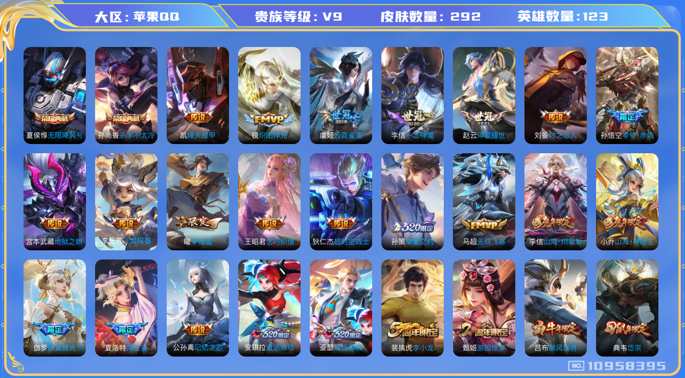 [10958395]【商品标题】:苹果Q-V9-永恒钻石III段位-123英雄-292皮肤-2典藏-0珍品无双-0无双-0珍品传说-35传说-94史诗