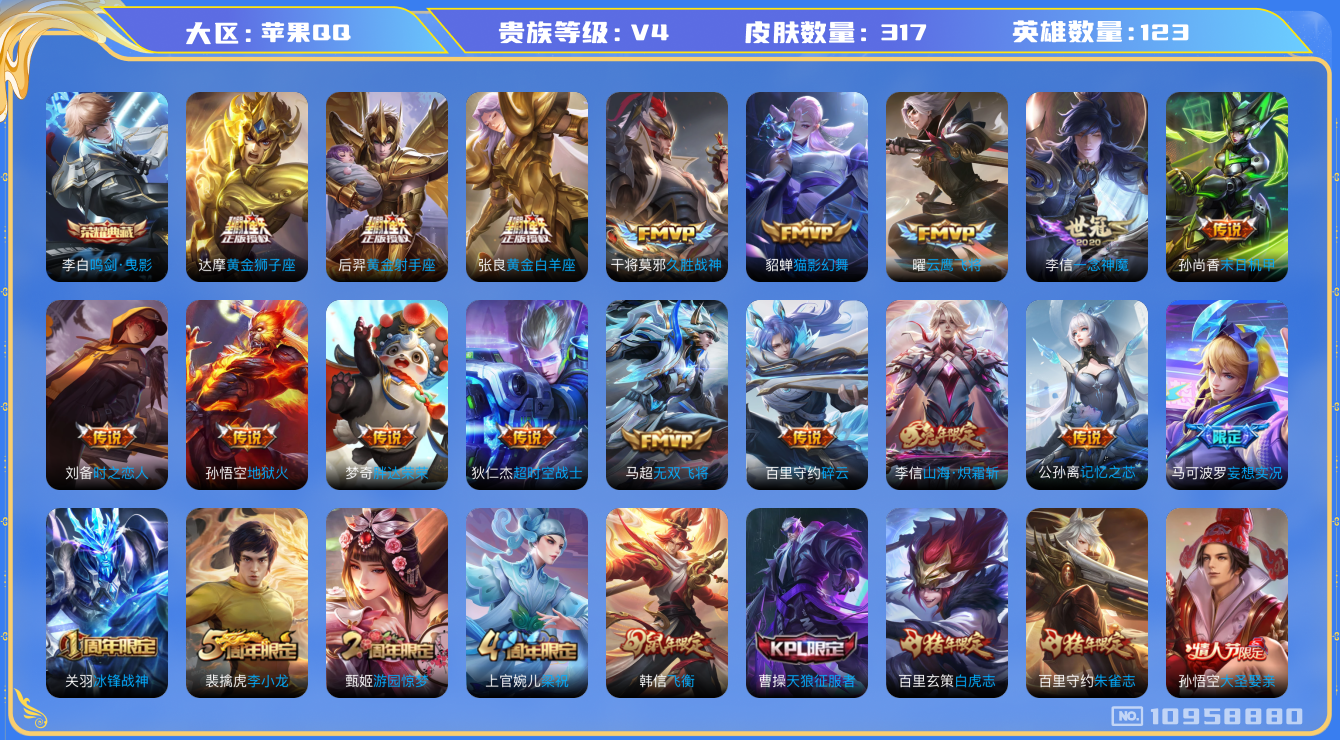 [10958880]【商品标题】:苹果Q-V4-最强王者段位-123英雄-317皮肤-1典藏-0珍品无双-0无双-0珍品传说-23传说-83史诗