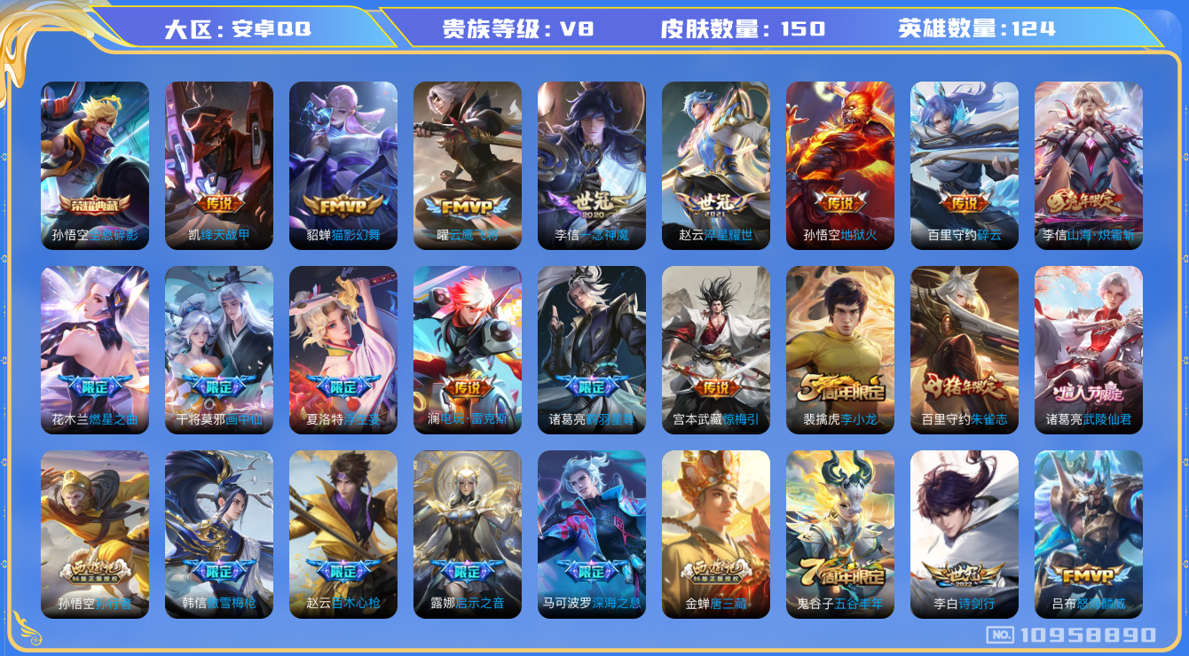 [10958890]【商品标题】:安卓Q-V8-至尊星耀V段位-124英雄-150皮肤-1典藏-0珍品无双-0无双-0珍品传说-21传说-35史诗