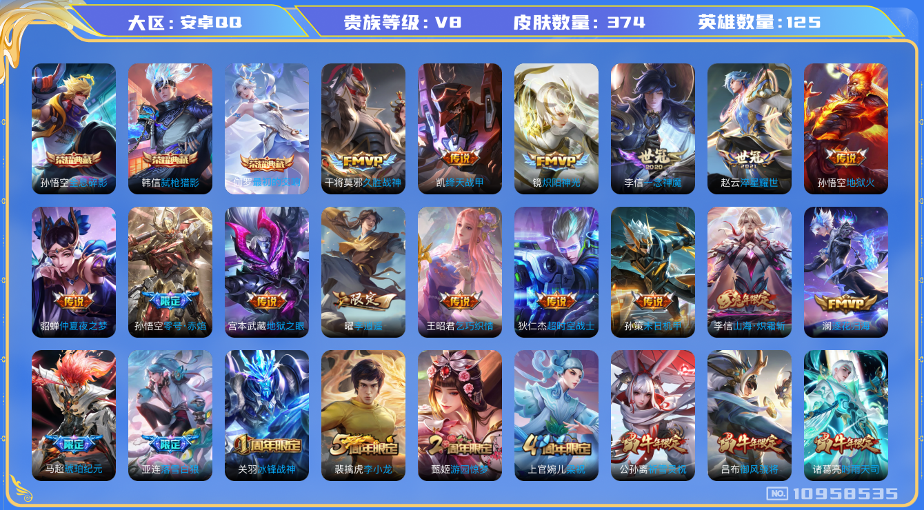 [10958535]【商品标题】:安卓Q-V8-最强王者段位-125英雄-373皮肤-3典藏-0珍品无双-0无双-0珍品传说-24传说-115史诗