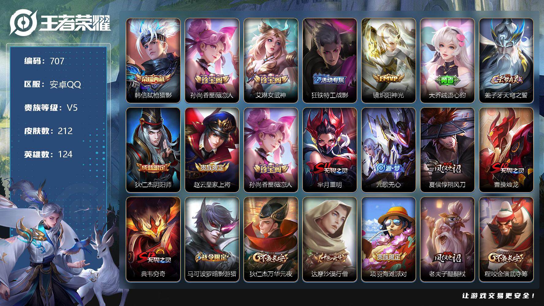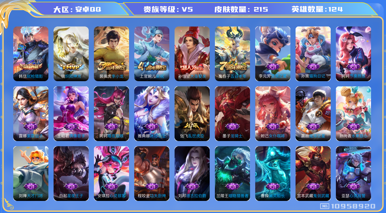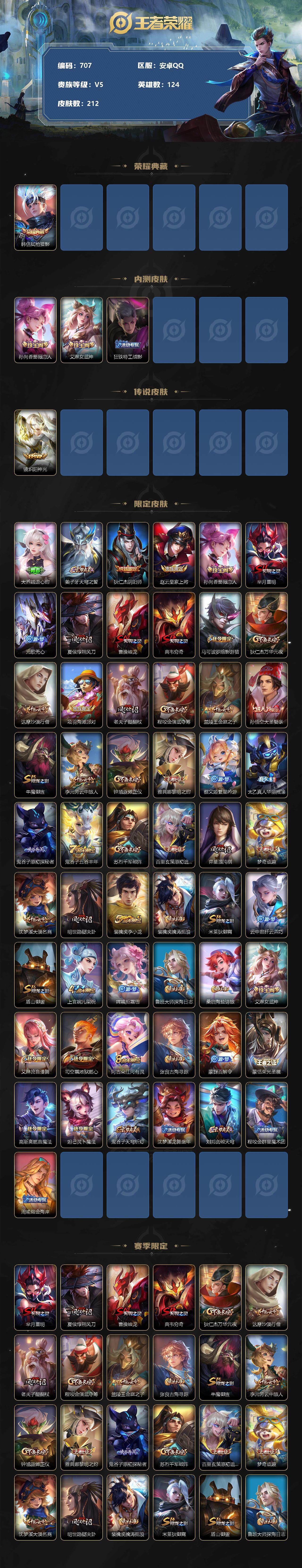 [10958920]【商品标题】:安卓Q-V5-最强王者段位-124英雄-212皮肤-1典藏-0珍品无双-0无双-0珍品传说-1传说-60史诗