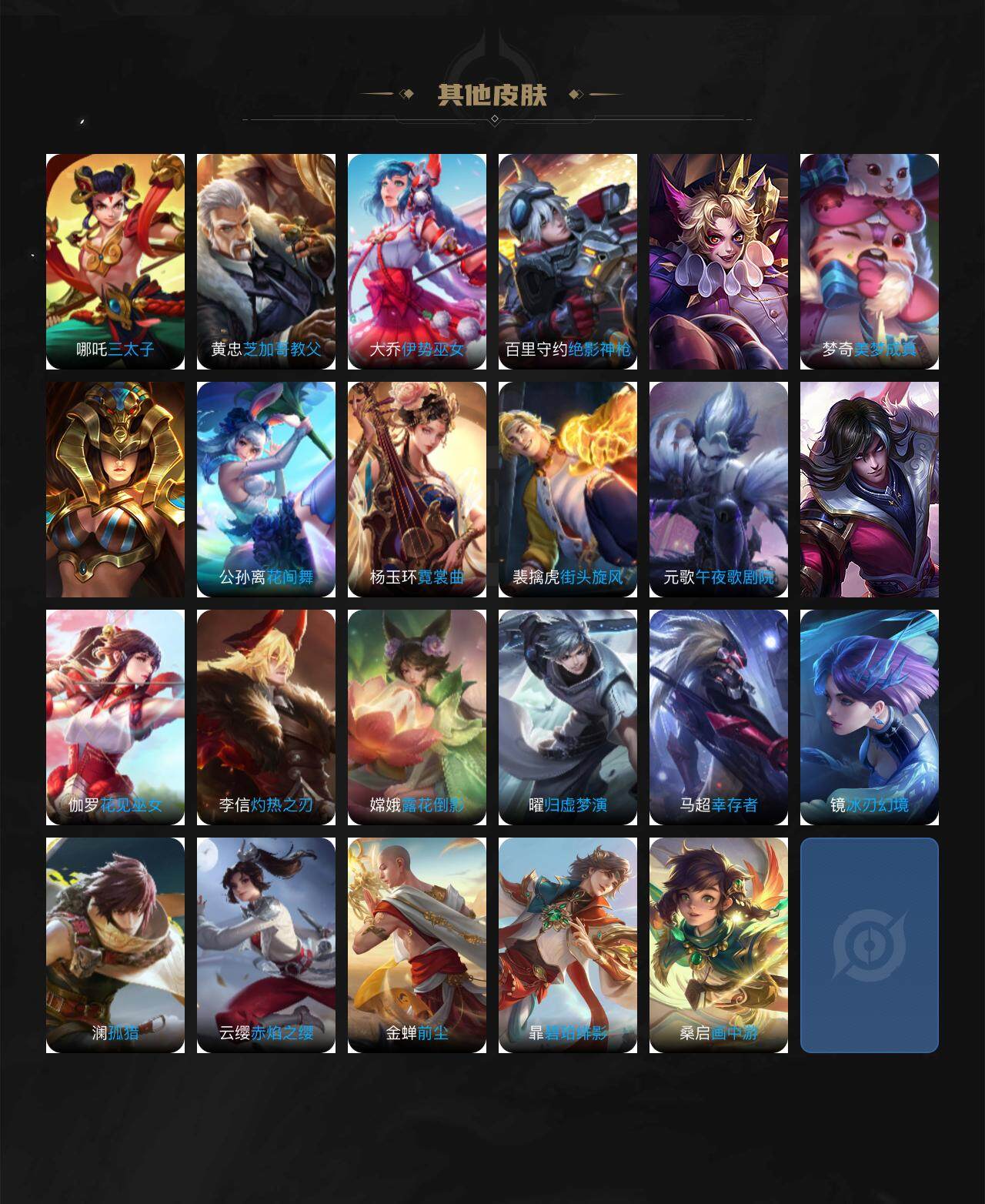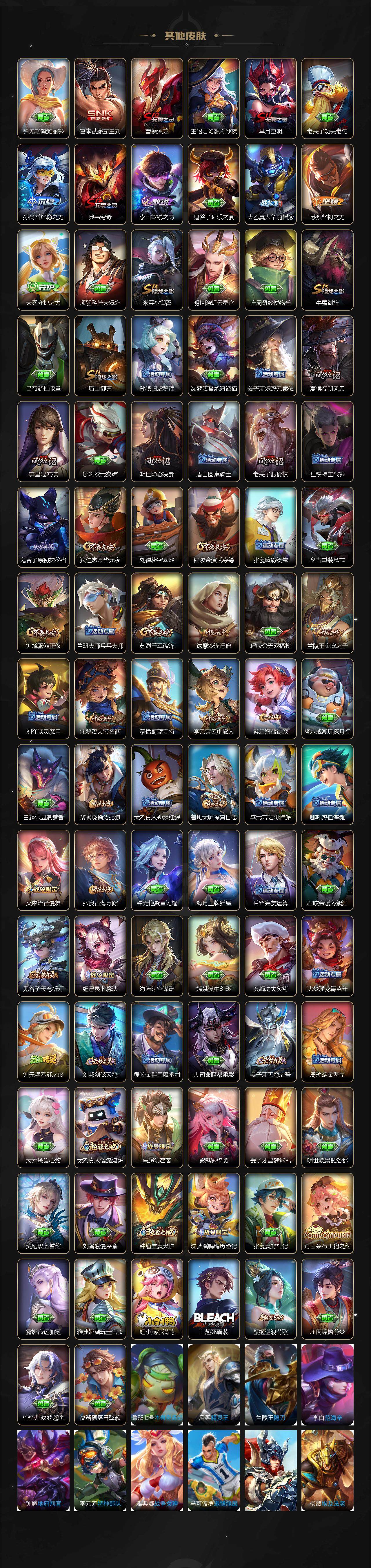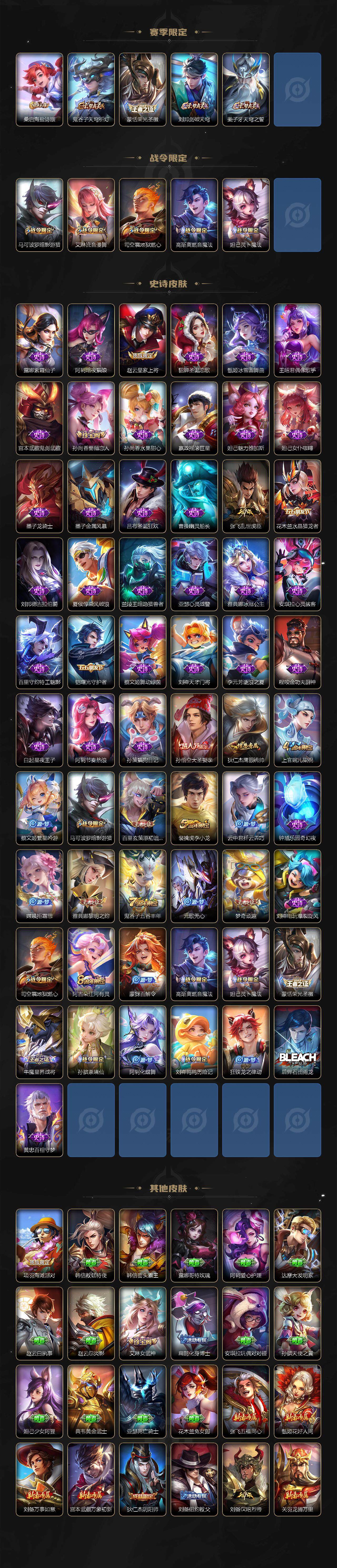 【赛季限定】:芈月重明,夏侯惇朔风刀,曹操烛龙,典韦穷奇,狄仁杰万华元夜,达摩沙漠行僧,老夫子醍醐杖,程咬金演武夺筹,兰陵王金庭之子,张良古海寻踪,牛魔御旌,李元芳云中旅人,钟馗驱傩正仪,雅典娜黎明之约,鬼谷子原初探秘者,苏烈千军破阵,百里玄策原初追逐者,弈星混沌棋,梦奇顽趣,沈梦溪大漠名商,明世隐疑决卦,裴擒虎擒涛扼浪,米莱狄御霄,盾山御銮,鲁班大师探海日志,桑启海盐诗旅,鬼谷子天穹祈灯,蒙恬荣光圣徽,刘邦剑破天穹,姜子牙天穹之誓