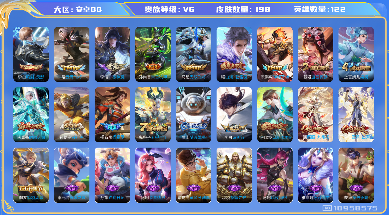 [10958575]【商品标题】:安卓Q-V6-最强王者段位-122英雄-198皮肤-1典藏-0珍品无双-0无双-0珍品传说-12传说-61史诗