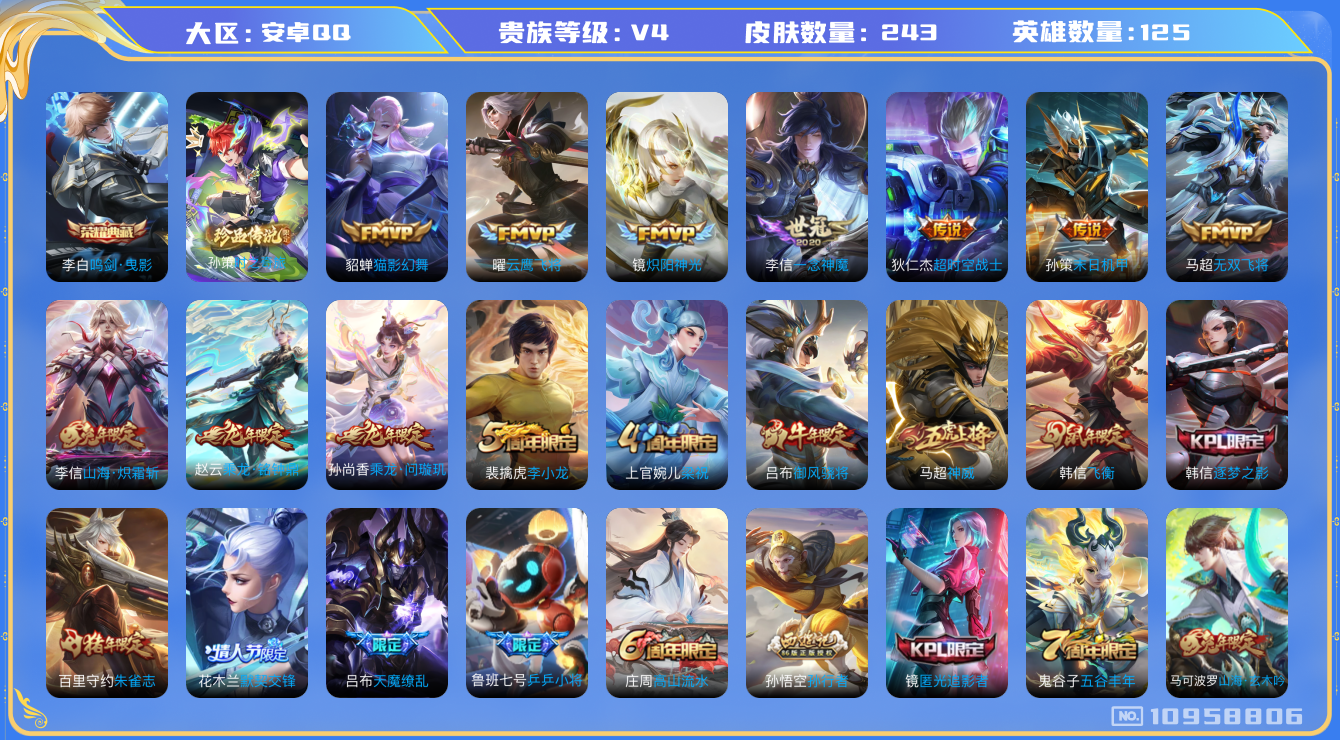 [10958806]【商品标题】:安卓Q-V4-至尊星耀I段位-125英雄-242皮肤-1典藏-0珍品无双-0无双-1珍品传说-14传说-78史诗