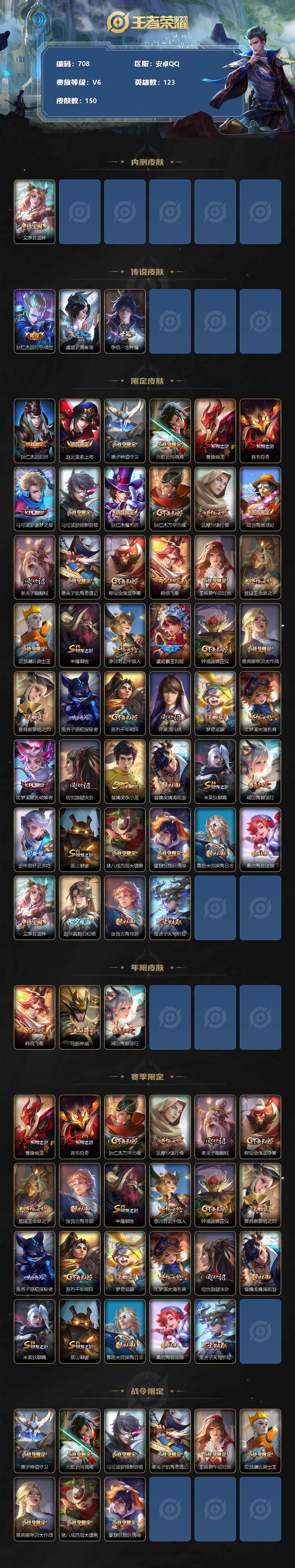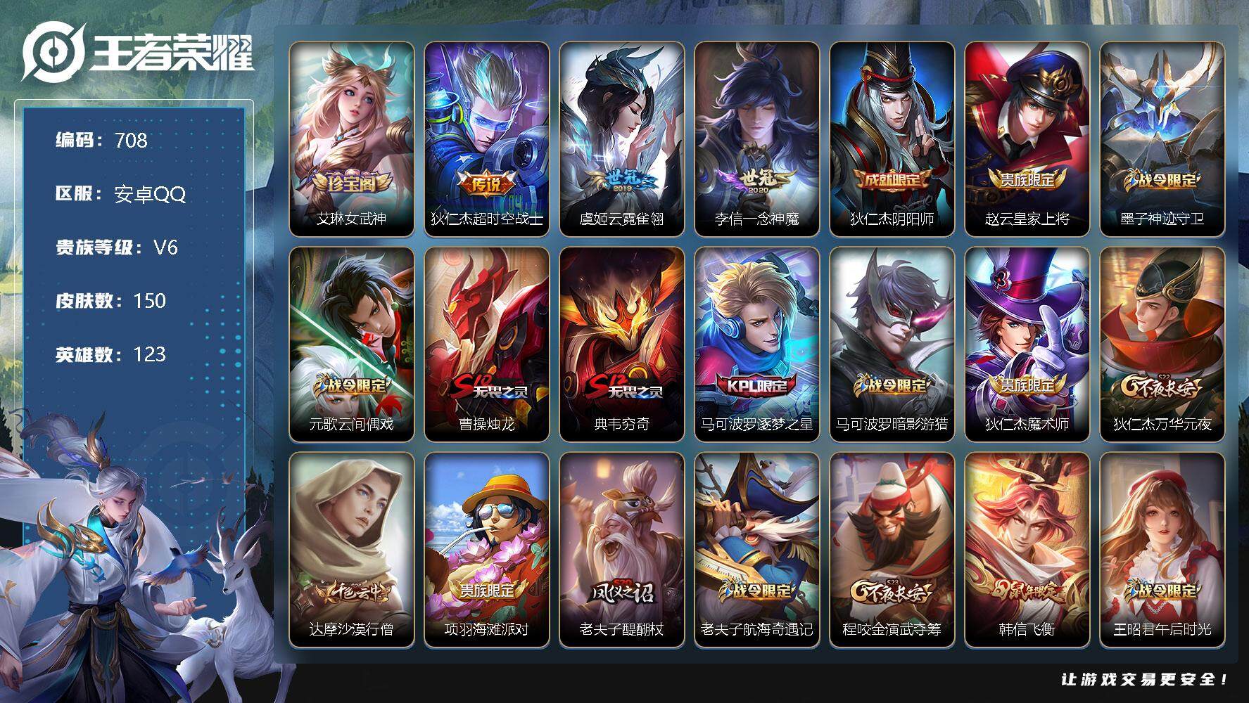 [10958926]【商品标题】:安卓Q-V6-尊贵铂金I段位-123英雄-150皮肤-0典藏-0珍品无双-0无双-0珍品传说-3传说-34史诗