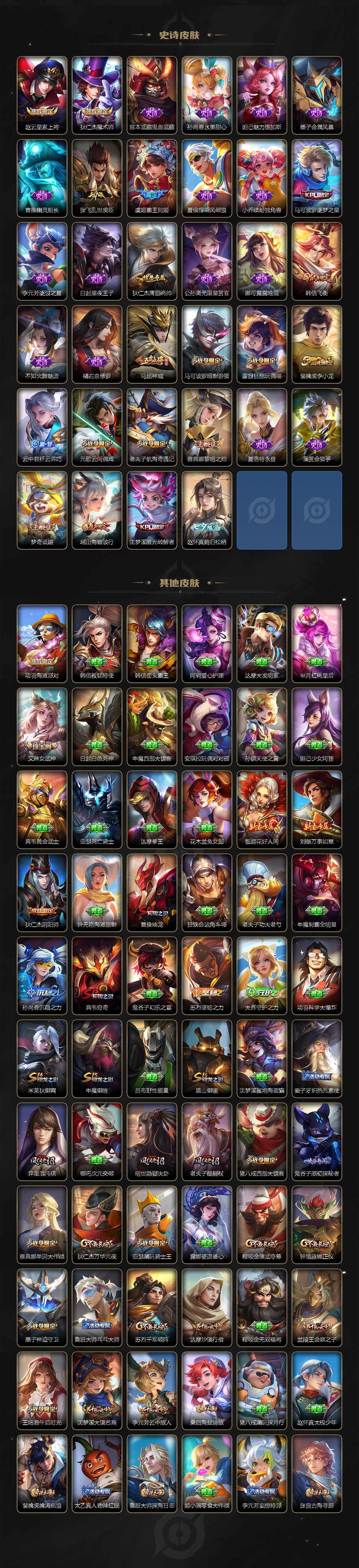 【史诗皮肤】:赵云皇家上将,狄仁杰魔术师,宫本武藏鬼剑武藏,孙尚香水果甜心,妲己魅力维加斯,墨子金属风暴,曹操幽灵船长,张飞乱世虎臣,虞姬霸王别姬,夏侯惇乘风破浪,小乔缤纷独角兽,马可波罗逐梦之星,李元芳逐浪之夏,白起星夜王子,狄仁杰鹰眼统帅,公孙离无限星赏官,娜可露露晚萤,韩信飞衡,不知火舞魅语,橘右京修罗,马超神威,马可波罗暗影游猎,蒙犽狂想玩偶喵,裴擒虎李小龙,云中君纤云弄巧,元歌云间偶戏,老夫子航海奇遇记,雅典娜黎明之约,夏洛特永昼,澜赏金猎手,梦奇顽趣,瑶山海碧波行,沈梦溪匿光破解者,赵怀真鹤归松栖