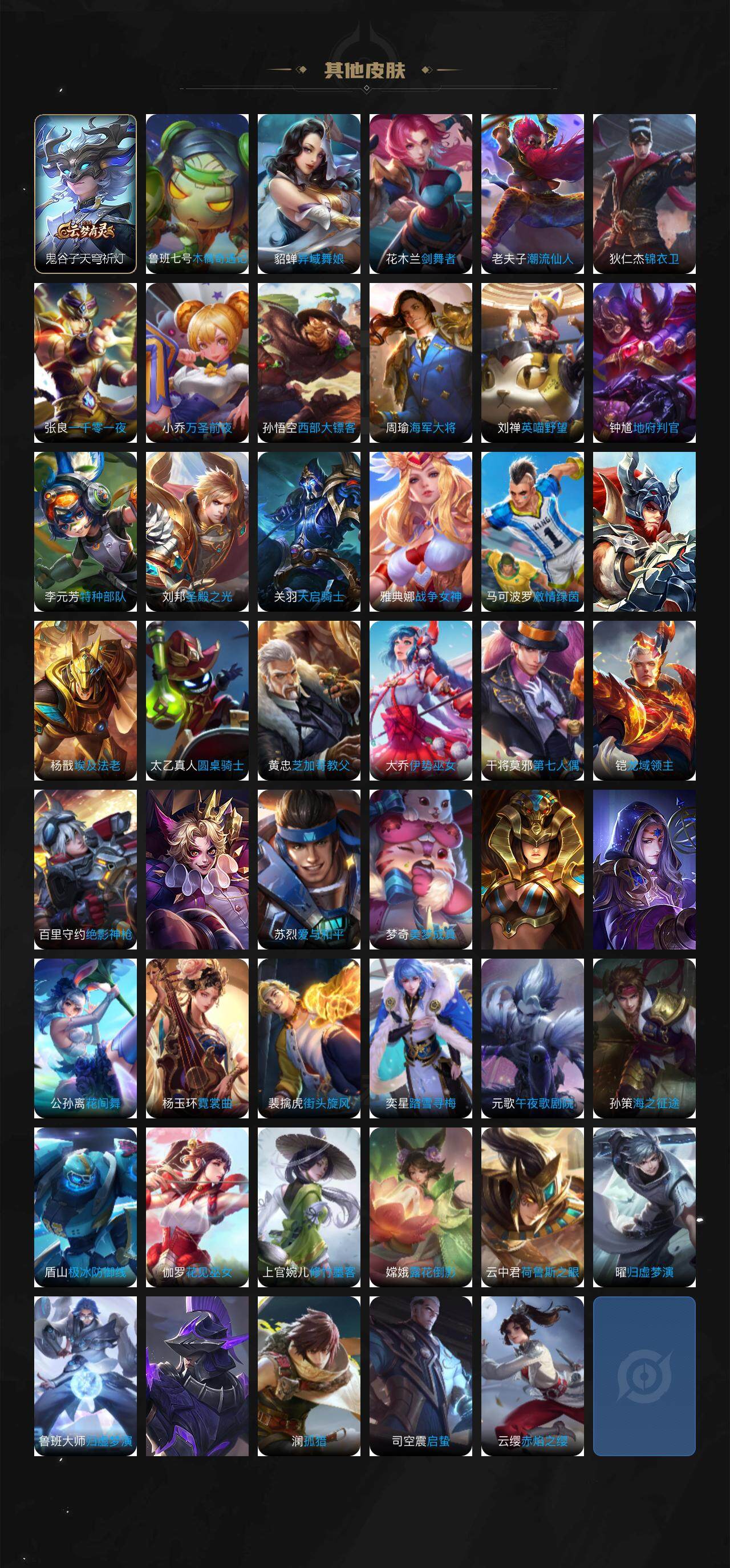 【限定皮肤】:狄仁杰阴阳师,赵云皇家上将,墨子神迹守卫,元歌云间偶戏,曹操烛龙,典韦穷奇,马可波罗逐梦之星,马可波罗暗影游猎,狄仁杰魔术师,狄仁杰万华元夜,达摩沙漠行僧,项羽海滩派对,老夫子醍醐杖,老夫子航海奇遇记,程咬金演武夺筹,韩信飞衡,王昭君午后时光,兰陵王金庭之子,亚瑟潮玩骑士王,牛魔御旌,李元芳云中旅人,虞姬霸王别姬,钟馗驱傩正仪,雅典娜单词大作战,雅典娜黎明之约,鬼谷子原初探秘者,苏烈千军破阵,弈星混沌棋,梦奇顽趣,沈梦溪大漠名商,沈梦溪匿光破解者,明世隐疑决卦,裴擒虎李小龙,裴擒虎擒涛扼浪,米莱狄御霄,瑶山海碧波行,云中君纤云弄巧,盾山御銮,猪八戒西部大镖客,蒙犽狂想玩偶喵,鲁班大师探海日志,桑启海盐诗旅,艾琳女武神,赵怀真鹤归松栖,张良古海寻踪,鬼谷子天穹祈灯