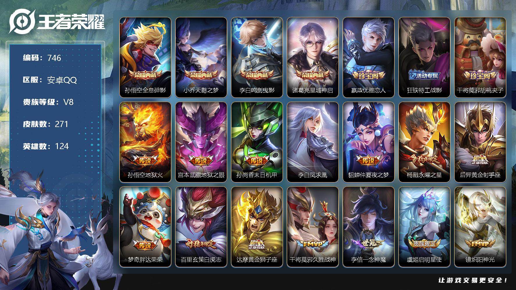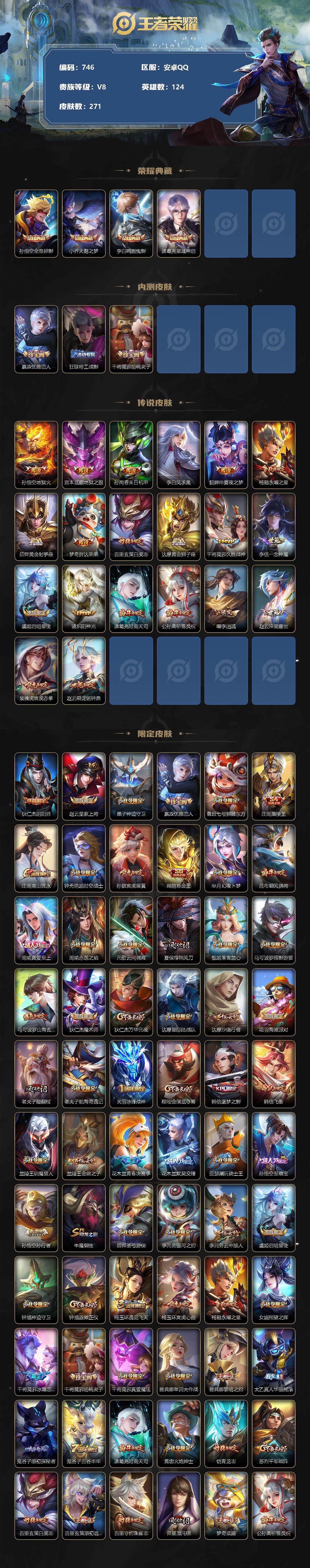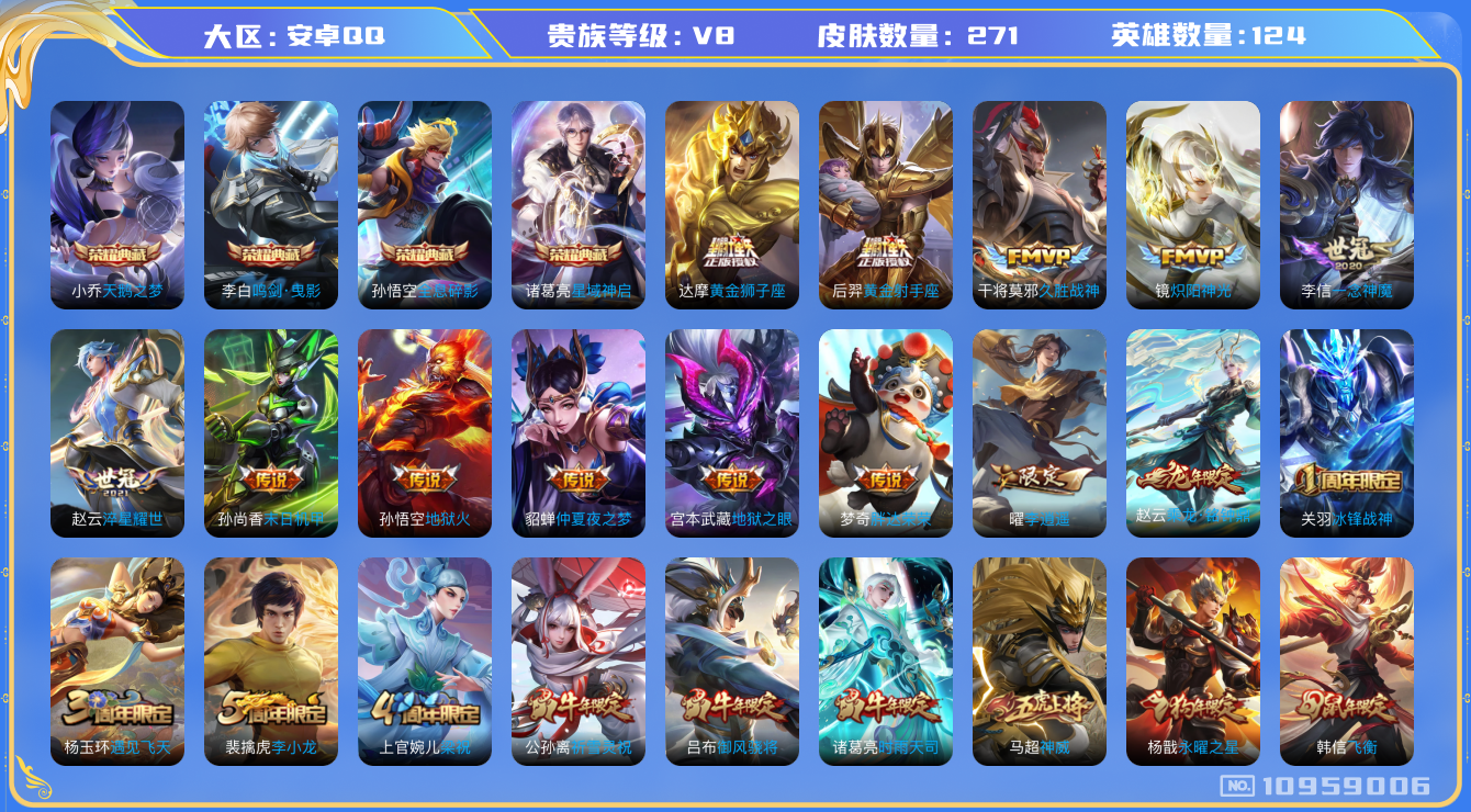 [10959006]【商品标题】:安卓Q-V8-最强王者段位-124英雄-271皮肤-4典藏-0珍品无双-0无双-0珍品传说-20传说-85史诗