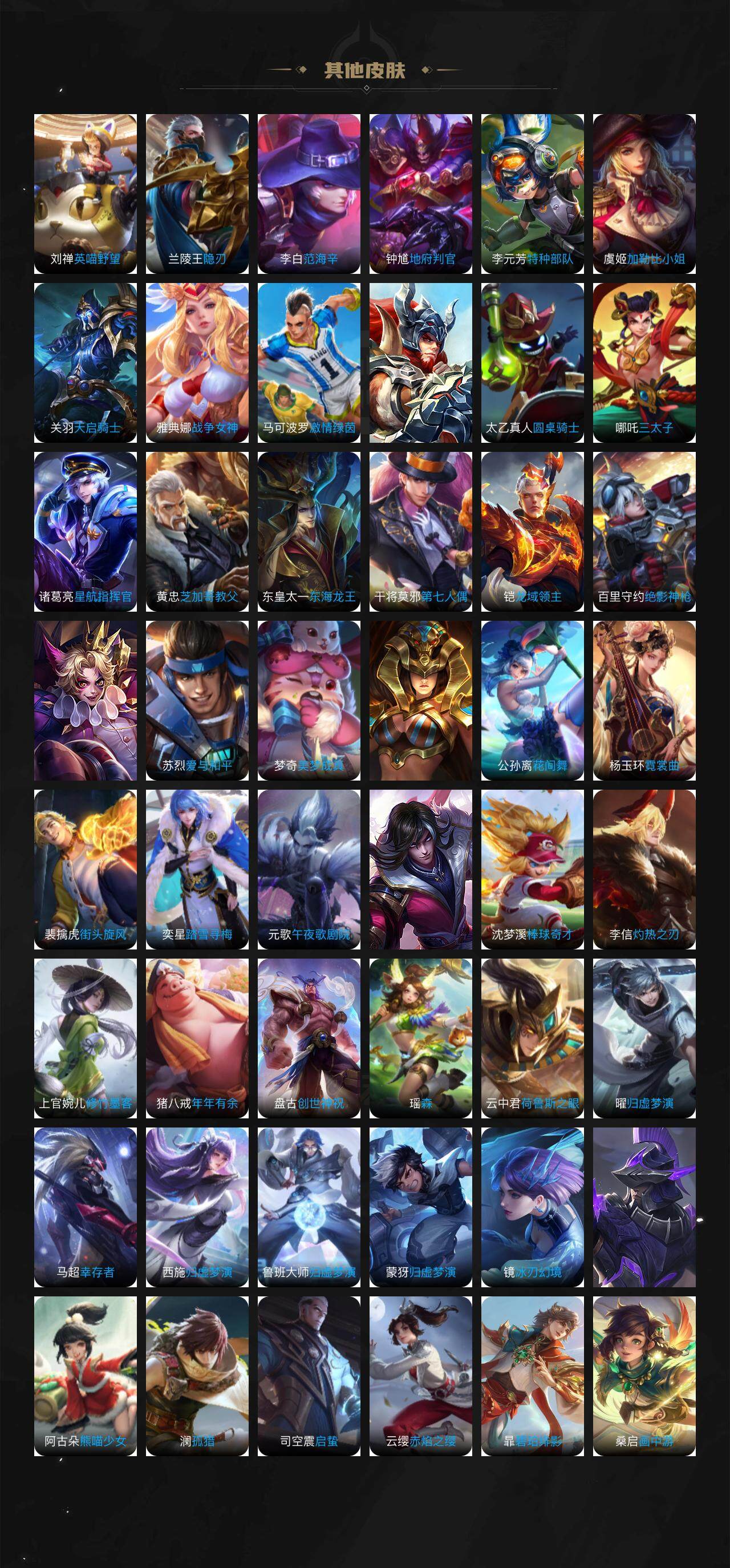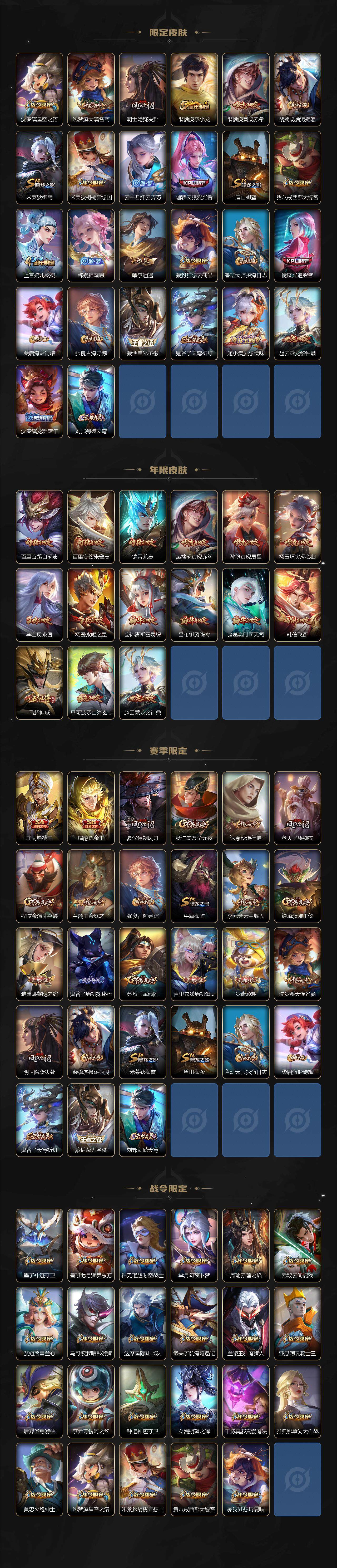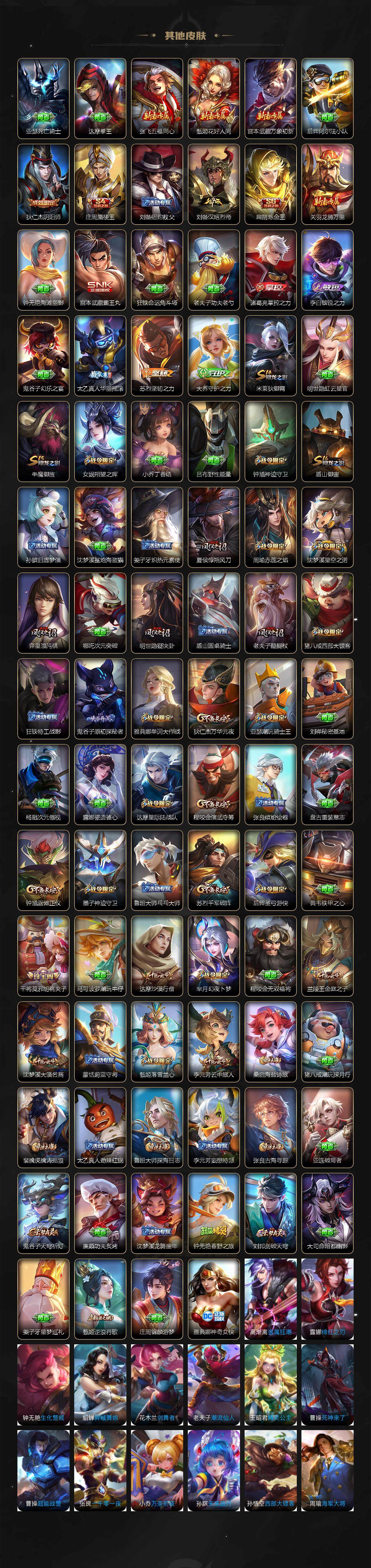 【限定皮肤】:狄仁杰阴阳师,赵云皇家上将,墨子神迹守卫,嬴政优雅恋人,鲁班七号狮舞东方,庄周蜃楼王,庄周高山流水,钟无艳超时空战士,孙膑寅虎展翼,扁鹊炼金王,芈月幻夜卜梦,吕布御风骁将,周瑜真爱至上,周瑜赤莲之焰,元歌云间偶戏,夏侯惇朔风刀,甄姬落雪兰心,马可波罗暗影游猎,马可波罗山海玄木吟,狄仁杰魔术师,狄仁杰万华元夜,达摩星际陆战队,达摩沙漠行僧,项羽海滩派对,老夫子醍醐杖,老夫子航海奇遇记,关羽冰锋战神,程咬金演武夺筹,韩信逐梦之影,韩信飞衡,兰陵王驯魔猎人,兰陵王金庭之子,花木兰青春决赛季,花木兰默契交锋,亚瑟潮玩骑士王,孙悟空至尊宝,孙悟空孙行者,牛魔御旌,后羿圣弓游侠,李元芳银河之约,李元芳云中旅人,虞姬启明星使,钟馗神迹守卫,钟馗驱傩正仪,杨玉环遇见飞天,杨玉环寅虎心曲,杨戬永曜之星,女娲朔望之晖,干将莫邪冰霜恋舞曲,干将莫邪胡桃夹子,干将莫邪真爱魔法,雅典娜单词大作战,雅典娜黎明之约,太乙真人华丽摇滚,鬼谷子原初探秘者,鬼谷子五谷丰年,诸葛亮时雨天司,黄忠火炮绅士,铠青龙志,苏烈千军破阵,百里玄策白虎志,百里玄策原初追逐者,百里守约朱雀志,弈星混沌棋,梦奇顽趣,公孙离祈雪灵祝,沈梦溪星空之诺,沈梦溪大漠名商,明世隐疑决卦,裴擒虎李小龙,裴擒虎寅虎赤拳,裴擒虎擒涛扼浪,米莱狄御霄,米莱狄胡桃异想国,云中君纤云弄巧,伽罗天狼溯光者,盾山御銮,猪八戒西部大镖客,上官婉儿梁祝,嫦娥拒霜思,曜李逍遥 ,蒙犽狂想玩偶喵,鲁班大师探海日志,镜匿光追影者,桑启海盐诗旅,张良古海寻踪,蒙恬荣光圣徽,鬼谷子天穹祈灯,姬小满妄想食味,赵云乘龙铭钟鼎,沈梦溪龙舞盛年,刘邦剑破天穹