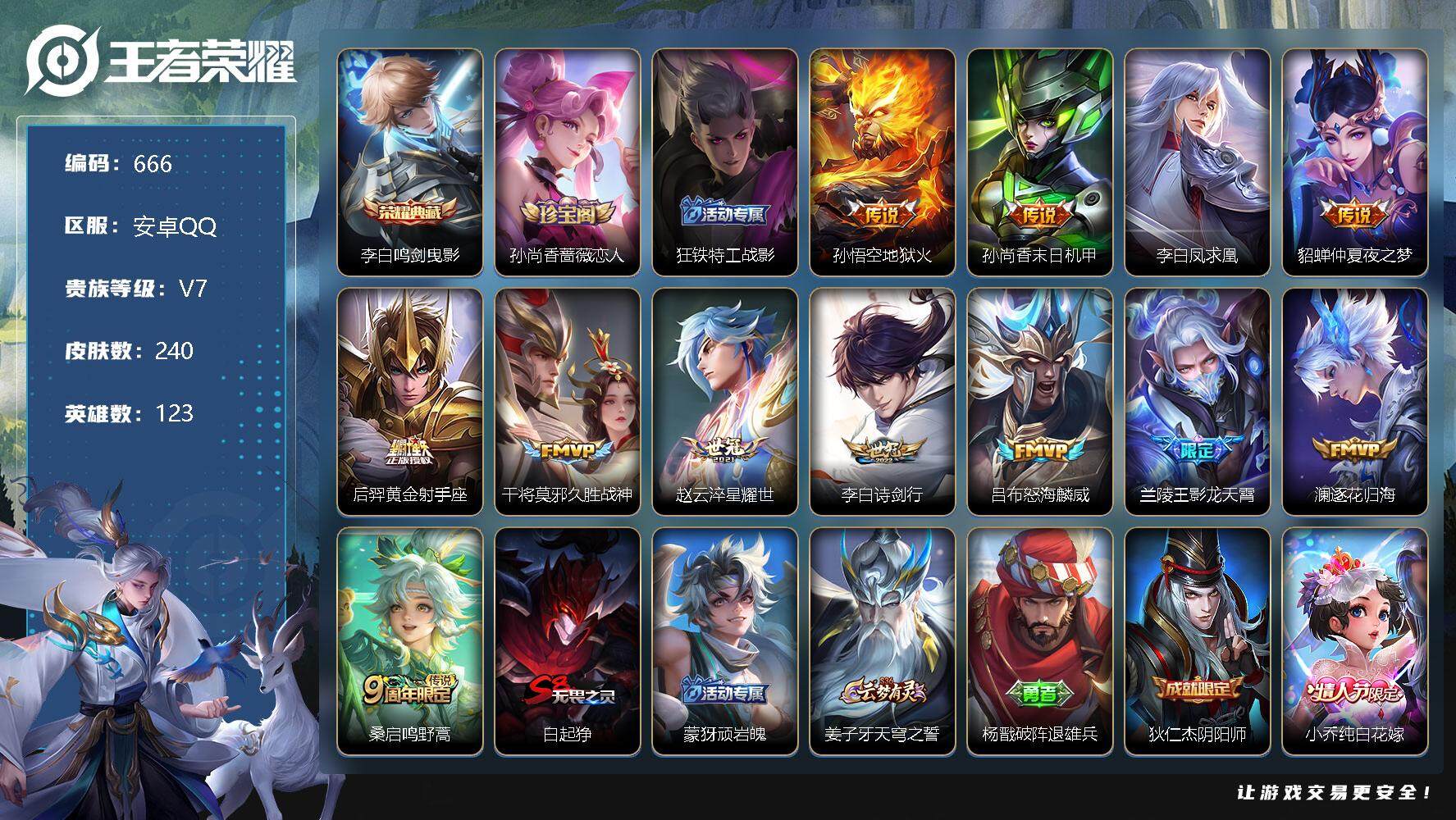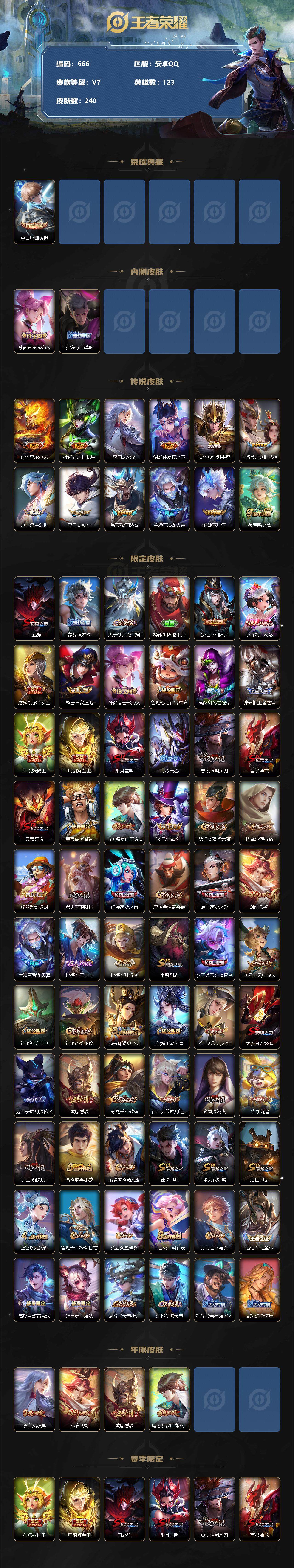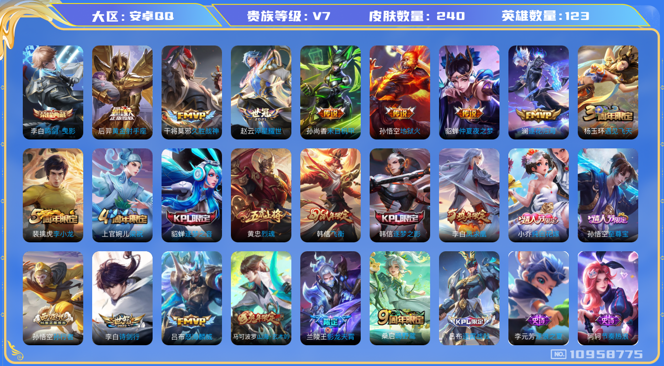 [10958775]【商品标题】:安卓Q-V7-最强王者段位-123英雄-240皮肤-1典藏-0珍品无双-0无双-0珍品传说-12传说-56史诗