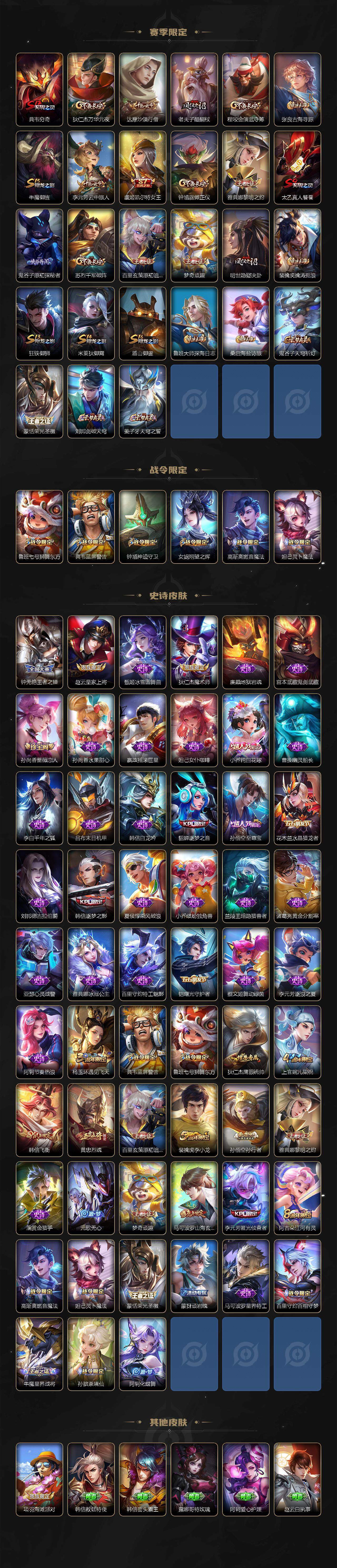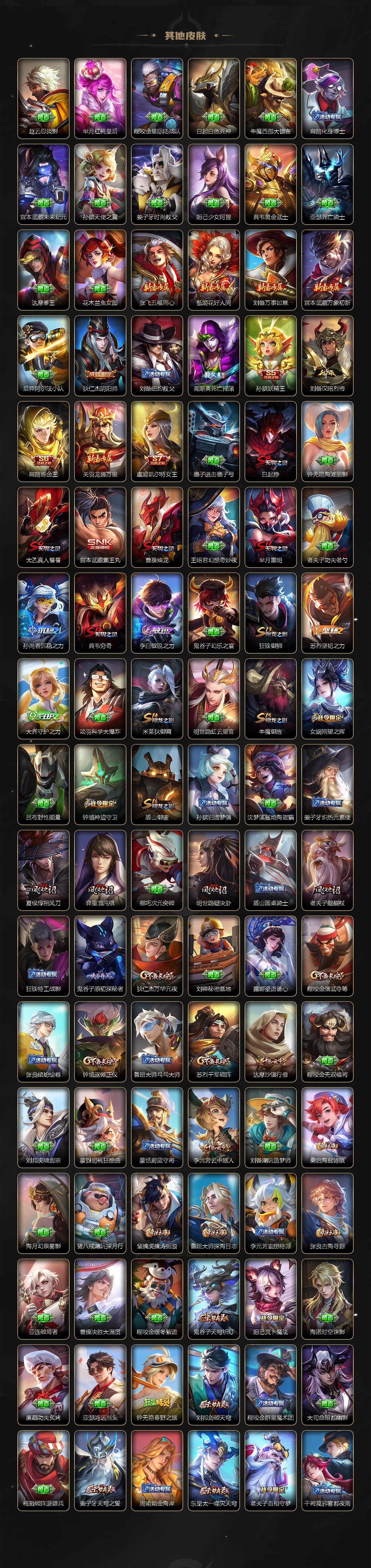 【赛季限定】:孙膑妖精王,扁鹊炼金王,白起狰,芈月重明,夏侯惇朔风刀,曹操烛龙,典韦穷奇,狄仁杰万华元夜,达摩沙漠行僧,老夫子醍醐杖,程咬金演武夺筹,张良古海寻踪,牛魔御旌,李元芳云中旅人,虞姬凯尔特女王,钟馗驱傩正仪,雅典娜黎明之约,太乙真人饕餮,鬼谷子原初探秘者,苏烈千军破阵,百里玄策原初追逐者,弈星混沌棋,梦奇顽趣,明世隐疑决卦,裴擒虎擒涛扼浪,狂铁御狮,米莱狄御霄,盾山御銮,鲁班大师探海日志,桑启海盐诗旅,鬼谷子天穹祈灯,蒙恬荣光圣徽,刘邦剑破天穹,姜子牙天穹之誓