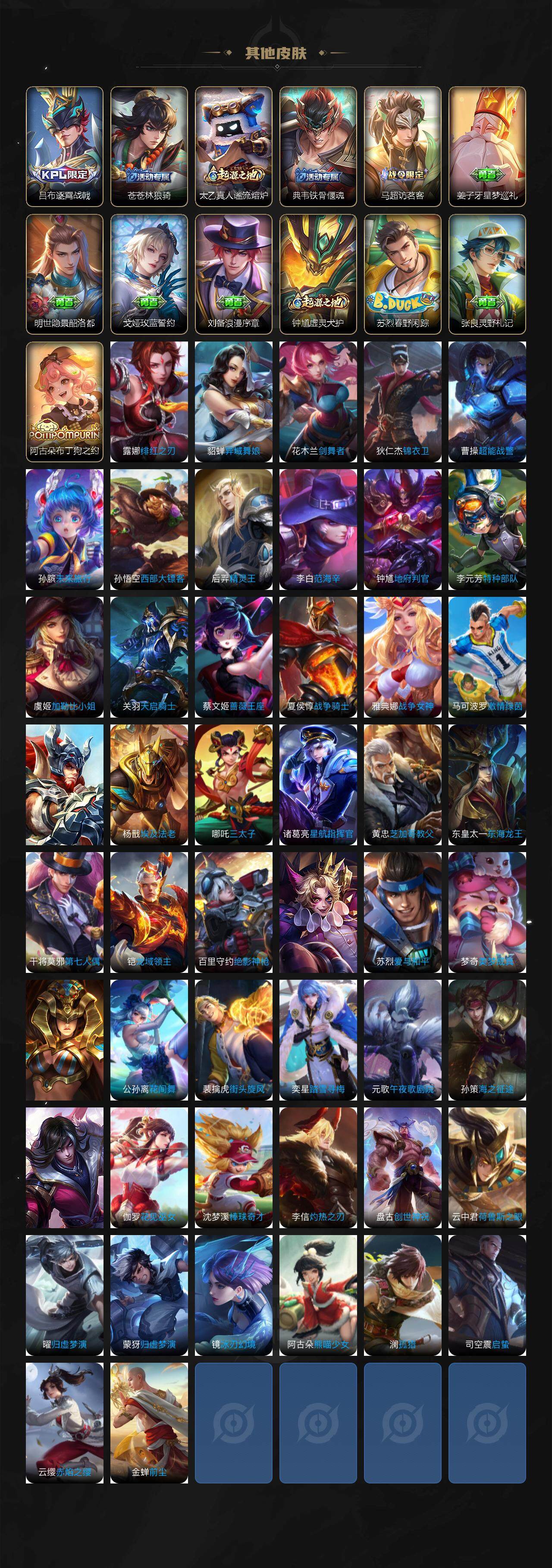 【限定皮肤】:白起狰,蒙犽顽岩魄,姜子牙天穹之誓,杨戬破阵退雄兵,狄仁杰阴阳师,小乔纯白花嫁,虞姬凯尔特女王,赵云皇家上将,孙尚香蔷薇恋人,鲁班七号狮舞东方,高渐离死亡摇滚,钟无艳王者之锤,孙膑妖精王,扁鹊炼金王,芈月重明,元歌无心,夏侯惇朔风刀,曹操烛龙,典韦穷奇,典韦蓝屏警告,马可波罗山海玄木吟,狄仁杰魔术师,狄仁杰万华元夜,达摩沙漠行僧,项羽海滩派对,老夫子醍醐杖,貂蝉逐梦之音,程咬金演武夺筹,韩信逐梦之影,韩信飞衡,兰陵王影龙天霄,孙悟空至尊宝,孙悟空孙行者,牛魔御旌,李元芳匿光侦查者,李元芳云中旅人,钟馗神迹守卫,钟馗驱傩正仪,杨玉环遇见飞天,女娲朔望之晖,雅典娜黎明之约,太乙真人饕餮,鬼谷子原初探秘者,黄忠烈魂,苏烈千军破阵,百里玄策原初追逐者,弈星混沌棋,梦奇顽趣,明世隐疑决卦,裴擒虎李小龙,裴擒虎擒涛扼浪,狂铁御狮,米莱狄御霄,盾山御銮,上官婉儿梁祝,鲁班大师探海日志,桑启海盐诗旅,阿古朵江河有灵,张良古海寻踪,蒙恬荣光圣徽,高渐离燃音魔法,妲己灵卜魔法,鬼谷子天穹祈灯,刘邦剑破天穹,程咬金群星魔术团,周瑜熔金海岸