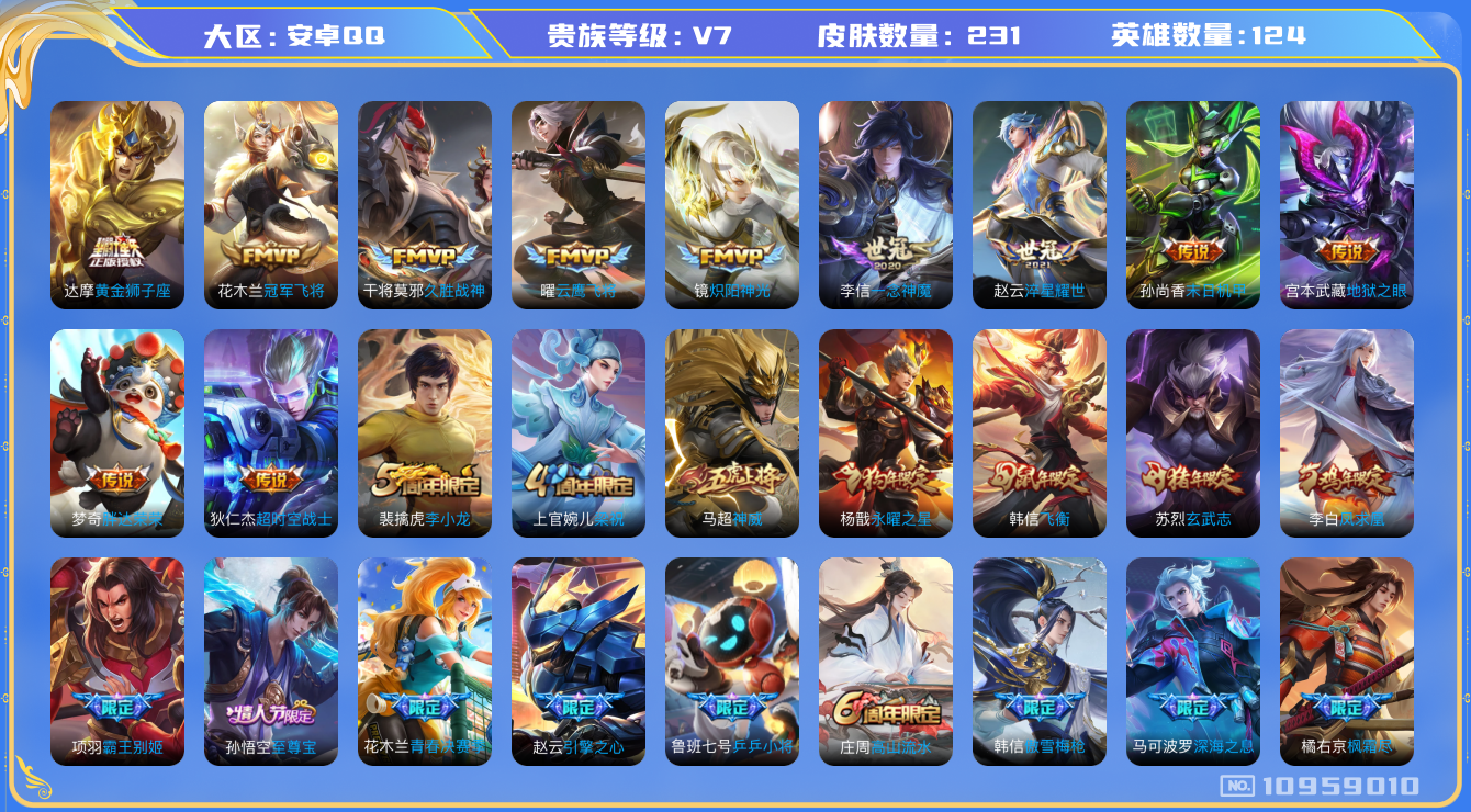 [10959010]【商品标题】:安卓Q-V7-永恒钻石III段位-124英雄-231皮肤-0典藏-0珍品无双-0无双-0珍品传说-17传说-62史诗