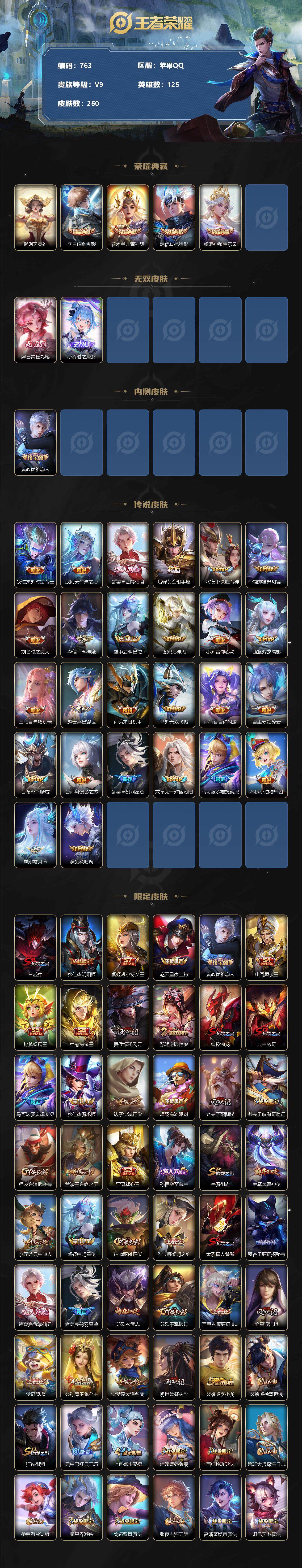 [10959055]【商品标题】:苹果Q-V9-至尊星耀IV段位-125英雄-260皮肤-4典藏-0珍品无双-2无双-0珍品传说-26传说-52史诗
