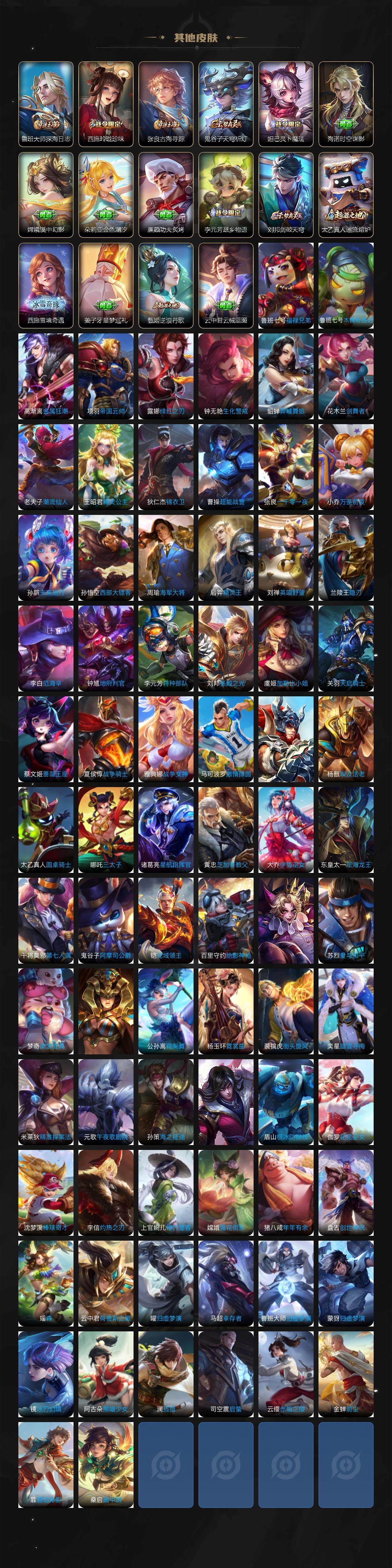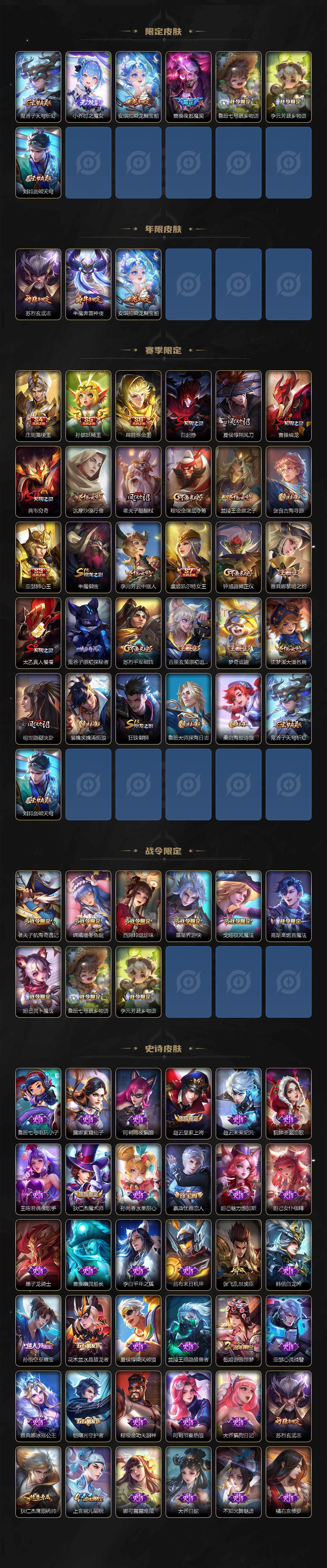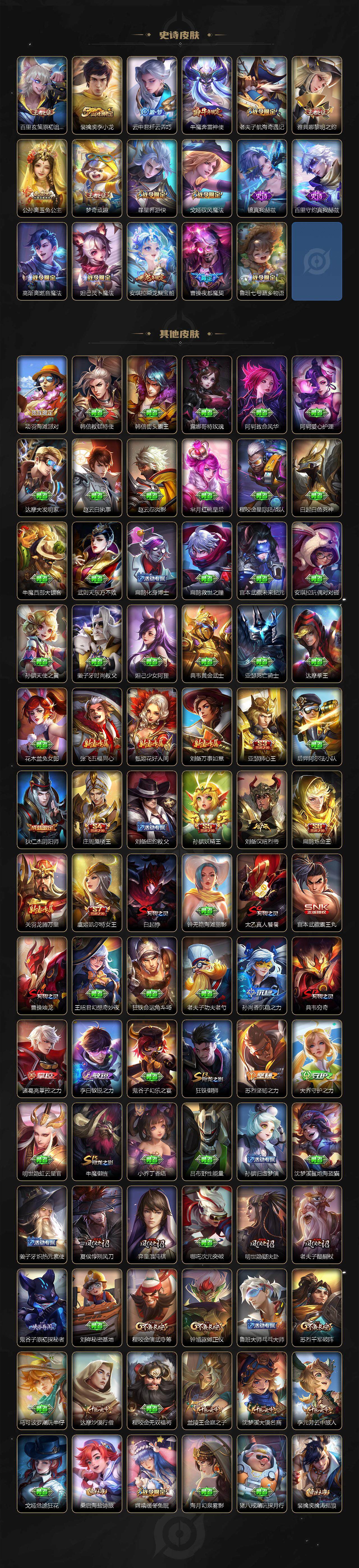 【限定皮肤】:白起狰,狄仁杰阴阳师,虞姬凯尔特女王,赵云皇家上将,嬴政优雅恋人,庄周蜃楼王,孙膑妖精王,扁鹊炼金王,夏侯惇朔风刀,甄姬游园惊梦,曹操烛龙,典韦穷奇,马可波罗妄想实况,狄仁杰魔术师,达摩沙漠行僧,项羽海滩派对,老夫子醍醐杖,老夫子航海奇遇记,程咬金演武夺筹,兰陵王金庭之子,亚瑟狮心王,孙悟空至尊宝,牛魔御旌,牛魔奔雷神使,李元芳云中旅人,虞姬启明星使,钟馗驱傩正仪,雅典娜黎明之约,太乙真人饕餮,鬼谷子原初探秘者,诸葛亮武陵仙君,诸葛亮鹤羽星尊,苏烈玄武志,苏烈千军破阵,百里玄策原初追逐者,弈星混沌棋,梦奇顽趣,公孙离玉兔公主,沈梦溪大漠名商,明世隐疑决卦,裴擒虎李小龙,裴擒虎擒涛扼浪,狂铁御狮,云中君纤云弄巧,上官婉儿梁祝,嫦娥暖冬兔眠,西施玲珑珍味,鲁班大师探海日志,桑启海盐诗旅,暃星界游侠,戈娅驭风魔法,张良古海寻踪,高渐离燃音魔法,妲己灵卜魔法,鬼谷子天穹祈灯,小乔时之魔女,安琪拉乘龙聚宝船,曹操夜都魔契,鲁班七号蔬乡物语,李元芳蔬乡物语,刘邦剑破天穹