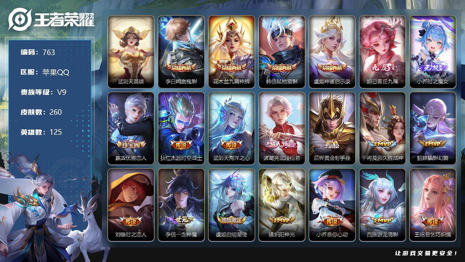 - [11293616]V9 3典藏 1珍品传说 15传说 125英雄 358皮肤 有退款 不能充值 典藏英雄武则天 可修改实名 优质装备:无限飓风号(高达),星域神启(倪克斯贼亮),幻阙歌(貂蝉典藏),江户川柯南,黄金狮子座,炽阳神光,末日机甲-孙尚香(绿蚂蚱),地狱之眼,淬星耀世,碎云,山海·琳琅生(小乔年限) 传说皮:云诺千山 珍宝阁皮:妄想食味,蔷薇恋人 限定皮:逐霄战戟,鸣野蒿,至尊宝,凤求凰(白切鸡),影龙天霄,遇见飞天,高山流水,齐天大圣,降魔,冰锋战神,游园惊梦,梁祝,逐梦之音,李小龙,逐梦之影,辉光之辰,霸王别姬-虞姬,默契交锋-兰陵王,启示之音,山海·玄木吟(马可年限) 史诗皮:苍鳞隐世,龙之律动,雪豹·霜爪,茶境仙,破空之剑,蔬乡物语(鲁班七号),乘龙·聚宝船(安琪拉年限),百相守梦-百里守约,紫霞仙子,苍穹之光,电玩小子(小书包),白龙吟,黄金分割率,特工魅影,千年之狐,永昼,江河有灵,魅语,百解令(蒙犽),高渐离燃音魔法,冰冠公主,青蛇,偶像歌手,电玩·爆裂旋风,暗夜猫娘,龙骑士(小龙虾),末日机甲-吕布,猫狗日记-孙策,猫狗日记-大乔,乱世虎臣,节奏热浪,修罗,女仆咖啡,摇滚巨星,水果甜心,绅士熊喵,天才门将,星夜王子,心灵骇客,时之奇旅-安琪拉,功夫厨神,德古拉伯爵,暗隐猎兽者,幽灵船长,鬼剑武藏,心灵战警,天秀·启明,舞动绿茵,地狱岩魂,诗语江南,纤云弄巧,拒霜思,缤纷独角兽,乘风破浪,逐浪之夏,水晶猎龙者,曙光守护者,箭羽风息,唤灵魅影,金属风暴,原初追逐者,圣诞狂欢,圣诞恋歌,鹰眼统帅,暗夜贵公子,魅力维加斯,赏金猎手,奇遇舞章,未来纪元-赵云1
