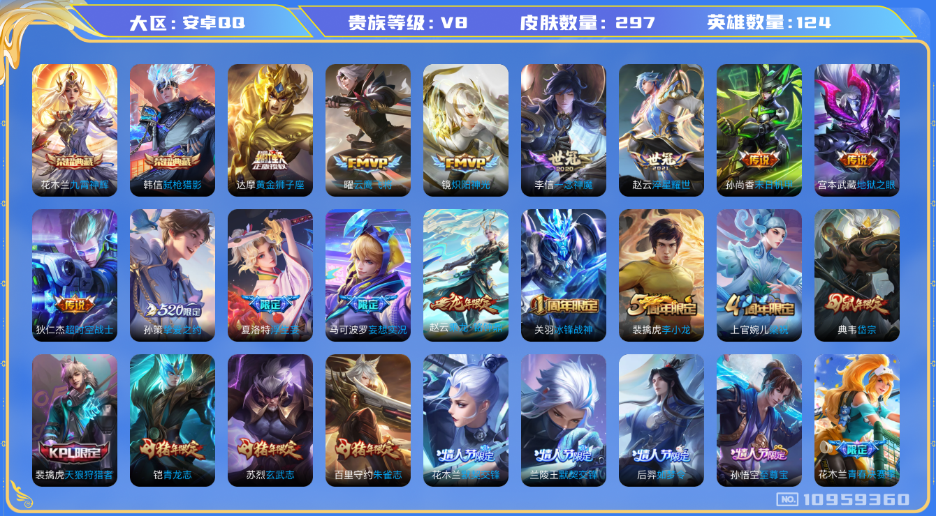 - [11283359]V8 2典藏 16传说 123英雄 356皮肤 可修改实名 优质装备:九霄神辉(木兰典藏),弑枪猎影(韩信典藏),黄金射手座,末日机甲-孙尚香(绿蚂蚱),遇见胡旋,山海·炽霜斩(李信年限),山海·苍雷引(电光曜子),电玩·雷克斯,云中君群星魔术团,牧神诗旅 珍宝阁皮:妄想食味,女武神,玩趣恶龙 限定皮:逐霄战戟,映山客,陌上桑,鸣野蒿,至尊宝,至美·乘鲤谣,高山流水,诗剑行,怒海麟威,降魔,五谷丰年,游园惊梦,梁祝,李小龙,朱雀志(守约年限),孙行者,天魔缭乱,深海之息(深海大菠萝),枫霜尽,神器·万象笔 史诗皮:化蝶舞,星界特工,星界战将,海诺心动手记,撼地雄心,破空之剑,蒙犽顽岩魄,怒海争锋,上官婉儿群星魔术团,蔬乡物语(鲁班七号),琥珀纪元伽罗,百相守梦-百里守约,紫霞仙子,黄金分割率,特工魅影,千年之狐,电玩·爆裂旋风,江河有灵,雪夜绮愿(周瑜),百解令(蒙犽),高渐离燃音魔法,银翎春语,蒙恬荣光圣徽,偶像歌手,龙骑士(小龙虾),魅语,冰冠公主,末日机甲-吕布,猫狗日记-孙策,猫狗日记-大乔,乱世虎臣,节奏热浪,女仆咖啡,摇滚巨星,水果甜心,天才门将,星夜王子,心灵骇客,功夫厨神,德古拉伯爵,暗隐猎兽者,幽灵船长,鬼剑武藏,心灵战警,舞动绿茵,地狱岩魂,纤云弄巧,拒霜思,缤纷独角兽,乘风破浪,逐浪之夏,水晶猎龙者,曙光守护者,箭羽风息,原初追逐者,圣诞恋歌,鹰眼统帅,王者之锤,魅力维加斯,黎明之约,赏金猎手,无心,未来纪元-赵云