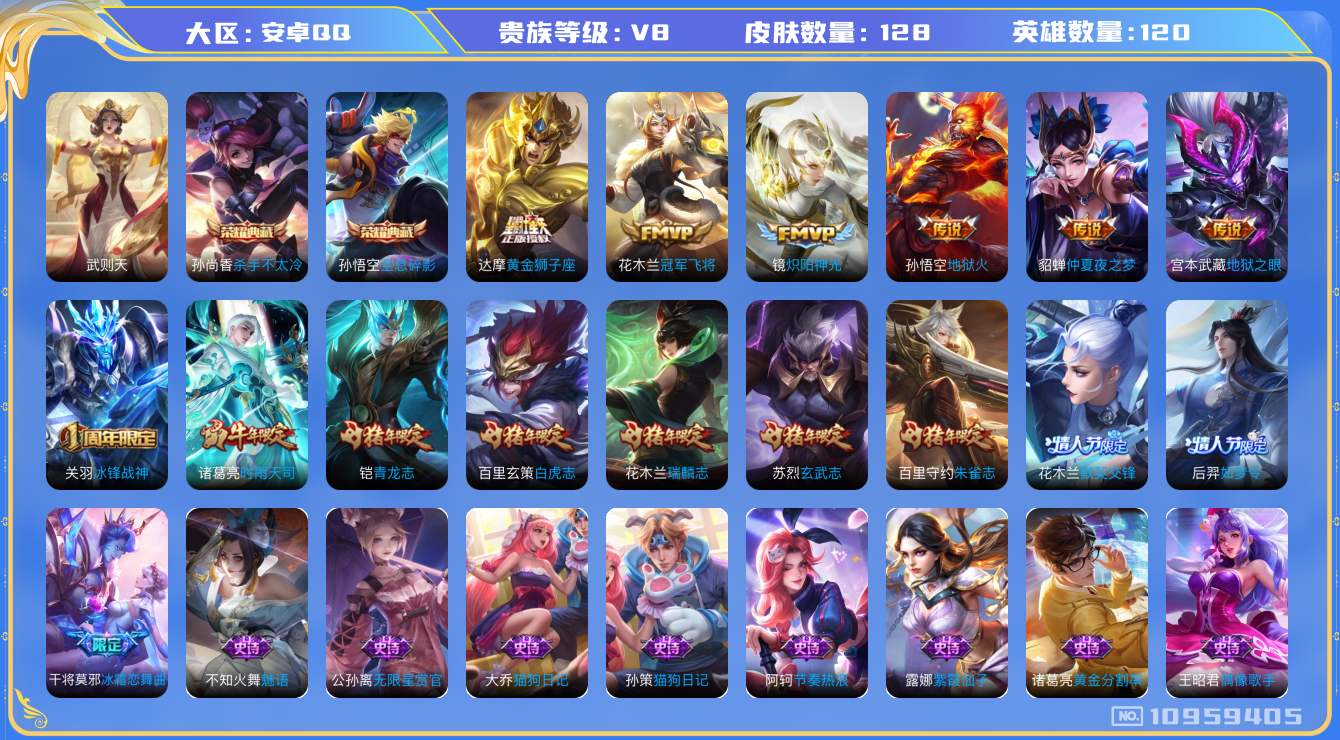 [10959405]【商品标题】:安卓Q-V8-最强王者段位-120英雄-128皮肤-2典藏-0珍品无双-0无双-0珍品传说-9传说-40史诗