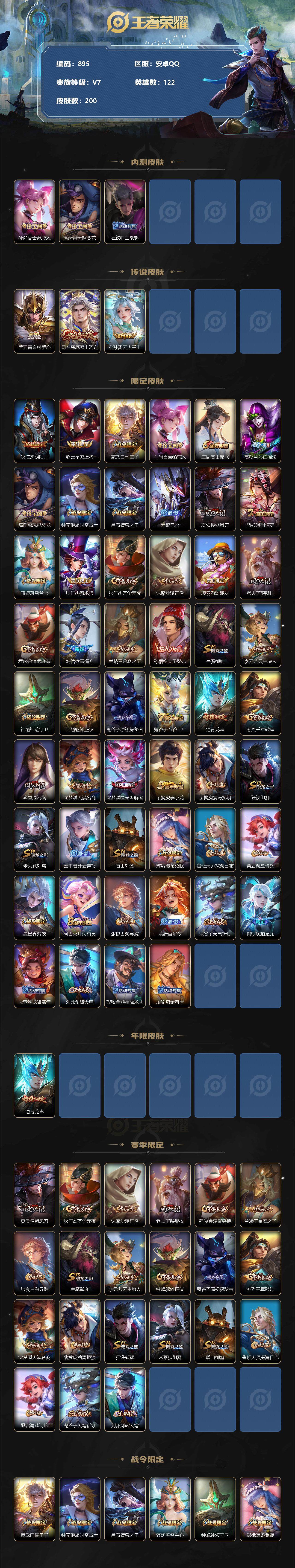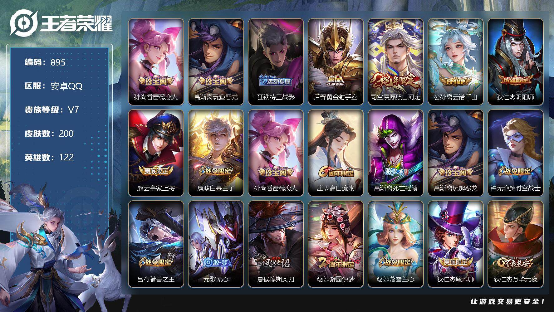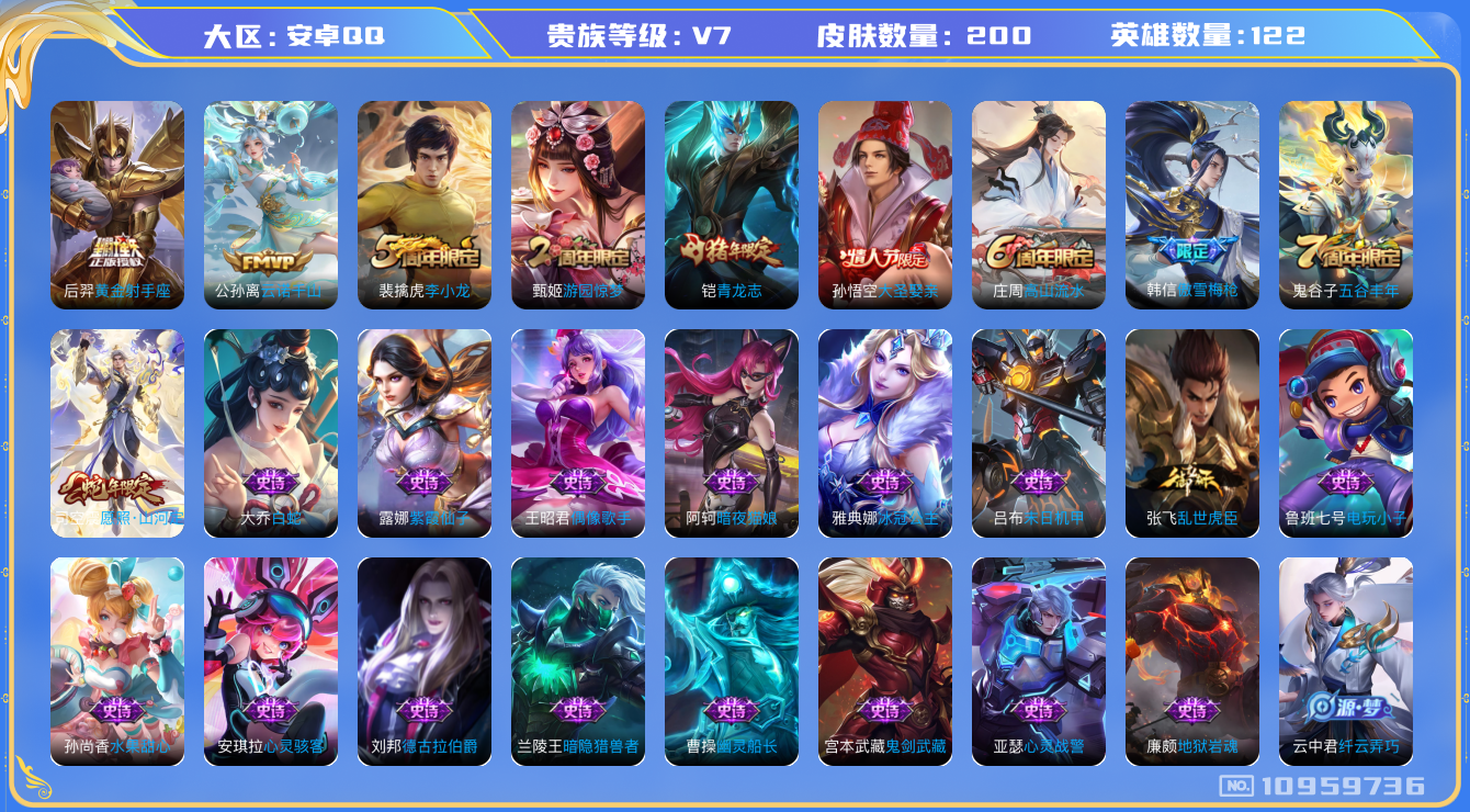 [10959736]【商品标题】:安卓Q-V7-永恒钻石I段位-122英雄-200皮肤-0典藏-0珍品无双-0无双-0珍品传说-3传说-52史诗