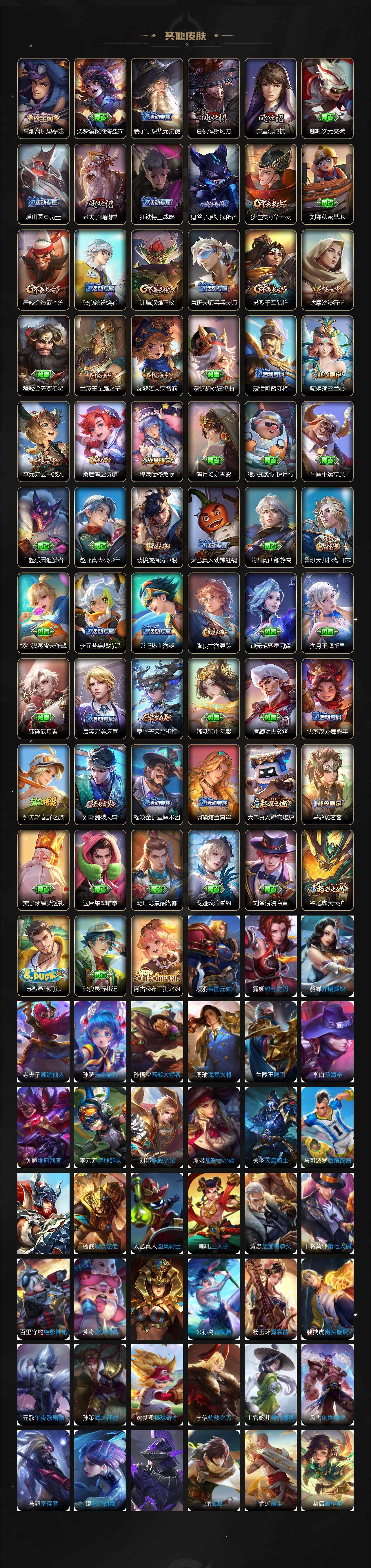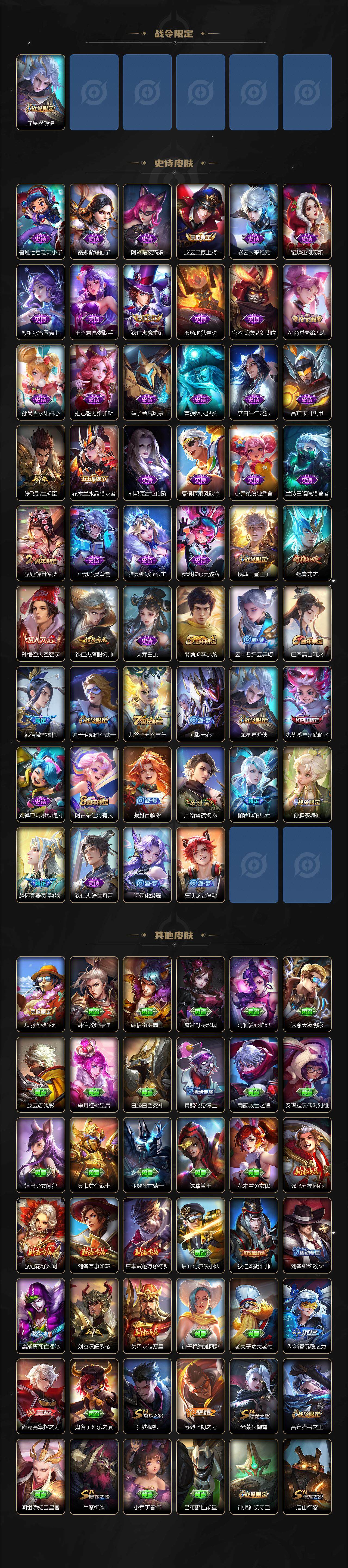 【限定皮肤】:狄仁杰阴阳师,赵云皇家上将,嬴政白昼王子,孙尚香蔷薇恋人,庄周高山流水,高渐离死亡摇滚,高渐离玩趣恶龙,钟无艳超时空战士,吕布猎兽之王,元歌无心,夏侯惇朔风刀,甄姬游园惊梦,甄姬落雪兰心,狄仁杰魔术师,狄仁杰万华元夜,达摩沙漠行僧,项羽海滩派对,老夫子醍醐杖,程咬金演武夺筹,韩信傲雪梅枪,兰陵王金庭之子,孙悟空大圣娶亲,牛魔御旌,李元芳云中旅人,钟馗神迹守卫,钟馗驱傩正仪,鬼谷子原初探秘者,鬼谷子五谷丰年,铠青龙志,苏烈千军破阵,弈星混沌棋,沈梦溪大漠名商,沈梦溪匿光破解者,裴擒虎李小龙,裴擒虎擒涛扼浪,狂铁御狮,米莱狄御霄,云中君纤云弄巧,盾山御銮,嫦娥暖冬兔眠,鲁班大师探海日志,桑启海盐诗旅,暃星界游侠,阿古朵江河有灵,张良古海寻踪,蒙犽百解令,鬼谷子天穹祈灯,伽罗琥珀纪元,沈梦溪龙舞盛年,刘邦剑破天穹,程咬金群星魔术团,周瑜熔金海岸