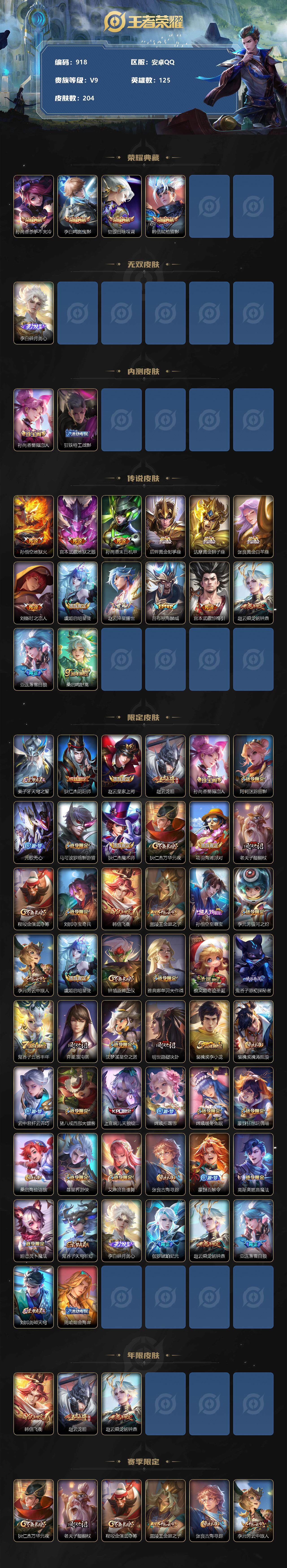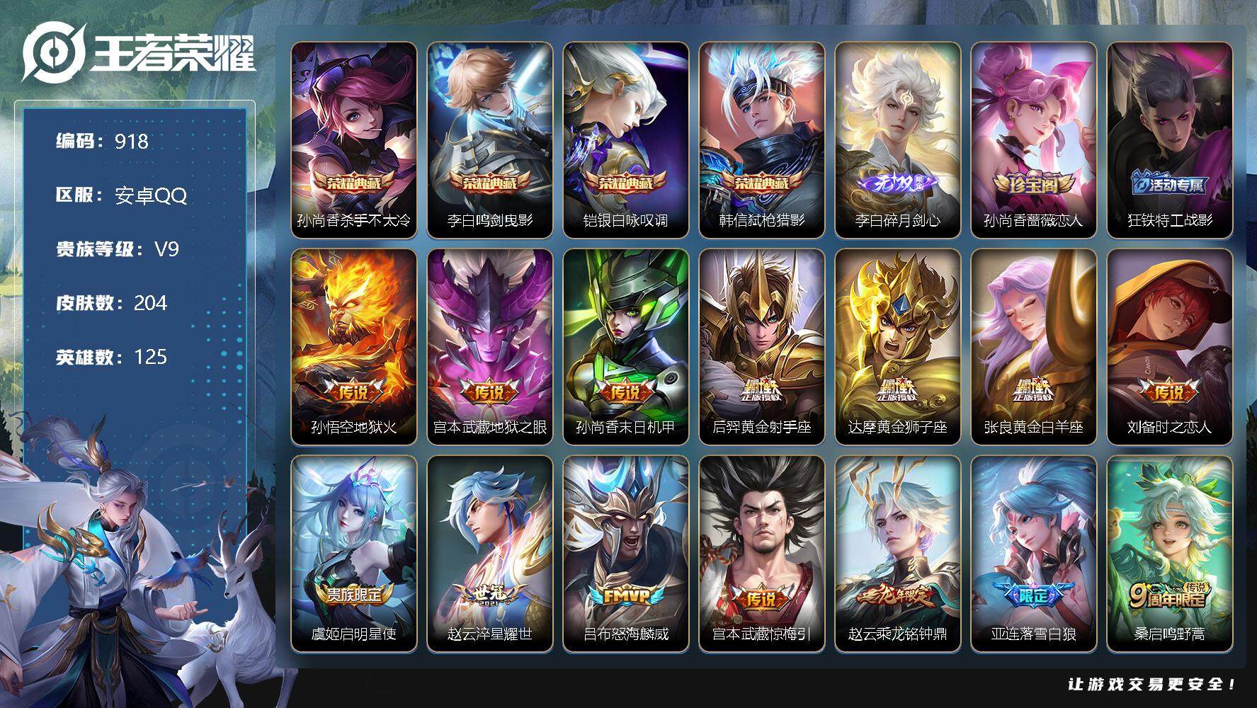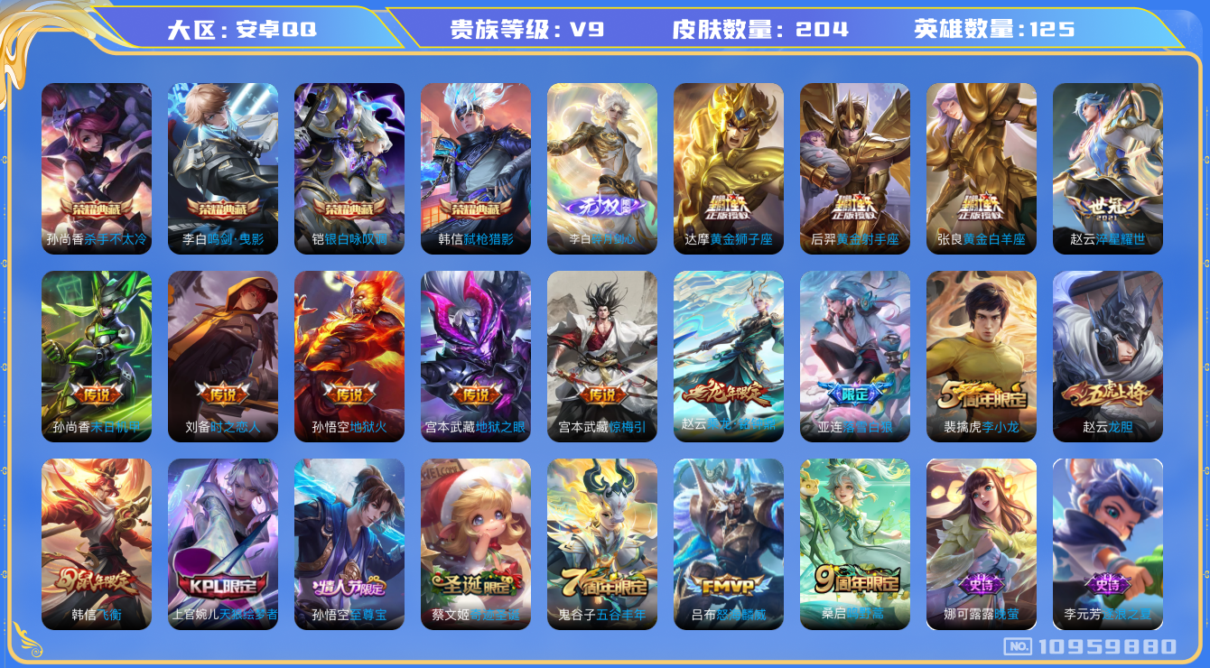 [10959880]【商品标题】:安卓Q-V9-永恒钻石IV段位-125英雄-204皮肤-4典藏-0珍品无双-1无双-0珍品传说-14传说-54史诗
