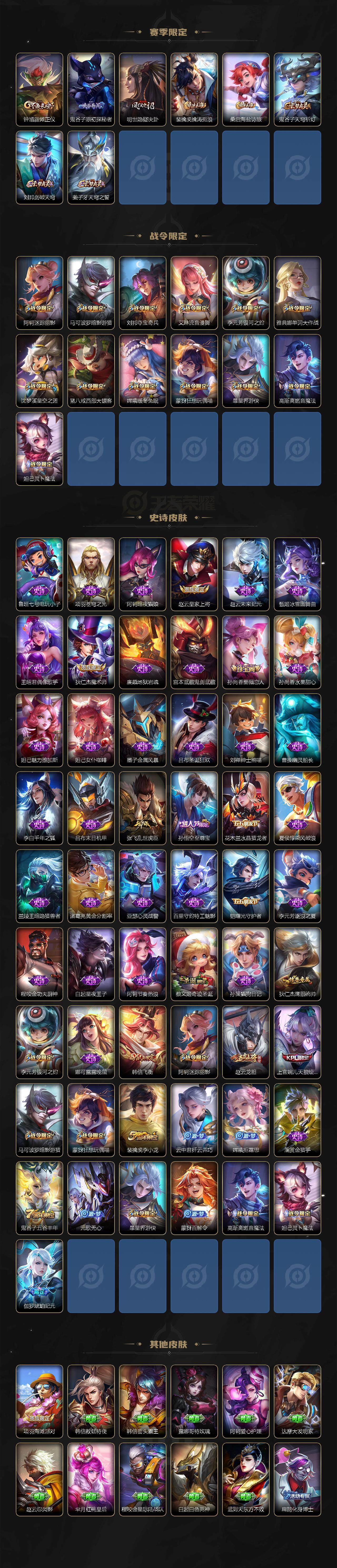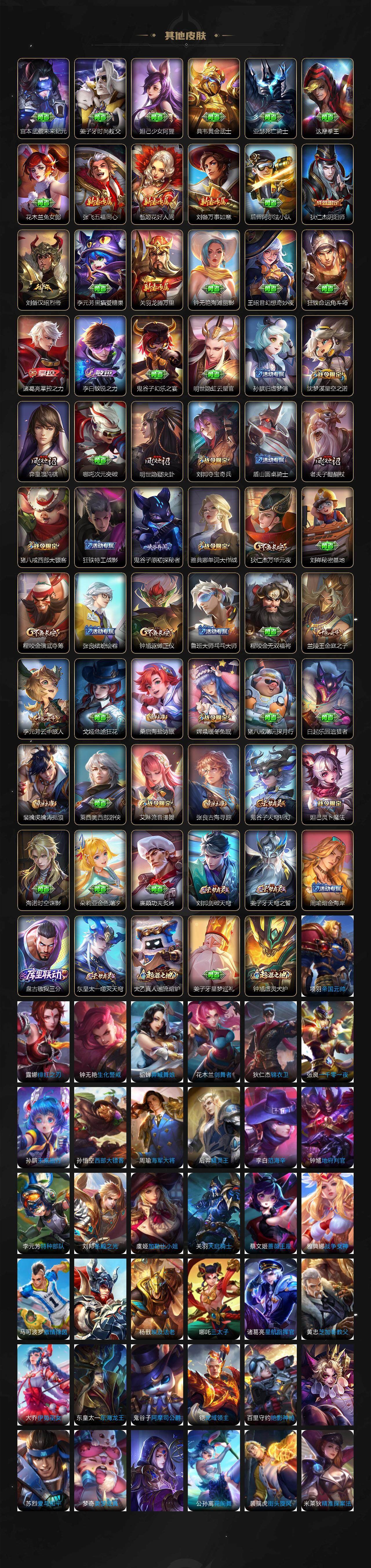 【限定皮肤】:姜子牙天穹之誓,狄仁杰阴阳师,赵云皇家上将,赵云龙胆,孙尚香蔷薇恋人,阿轲迷踪丽影,元歌无心,马可波罗暗影游猎,狄仁杰魔术师,狄仁杰万华元夜,项羽海滩派对,老夫子醍醐杖,程咬金演武夺筹,刘邦夺宝奇兵,韩信飞衡,兰陵王金庭之子,孙悟空至尊宝,李元芳银河之约,李元芳云中旅人,虞姬启明星使,钟馗驱傩正仪,雅典娜单词大作战,蔡文姬奇迹圣诞,鬼谷子原初探秘者,鬼谷子五谷丰年,弈星混沌棋,沈梦溪星空之诺,明世隐疑决卦,裴擒虎李小龙,裴擒虎擒涛扼浪,云中君纤云弄巧,猪八戒西部大镖客,上官婉儿天狼绘梦者,嫦娥拒霜思,嫦娥暖冬兔眠,蒙犽狂想玩偶喵,桑启海盐诗旅,暃星界游侠,艾琳流音漫舞,张良古海寻踪,蒙犽百解令,高渐离燃音魔法,妲己灵卜魔法,鬼谷子天穹祈灯,李白碎月剑心,伽罗琥珀纪元,赵云乘龙铭钟鼎,亚连落雪白狼,刘邦剑破天穹,周瑜熔金海岸