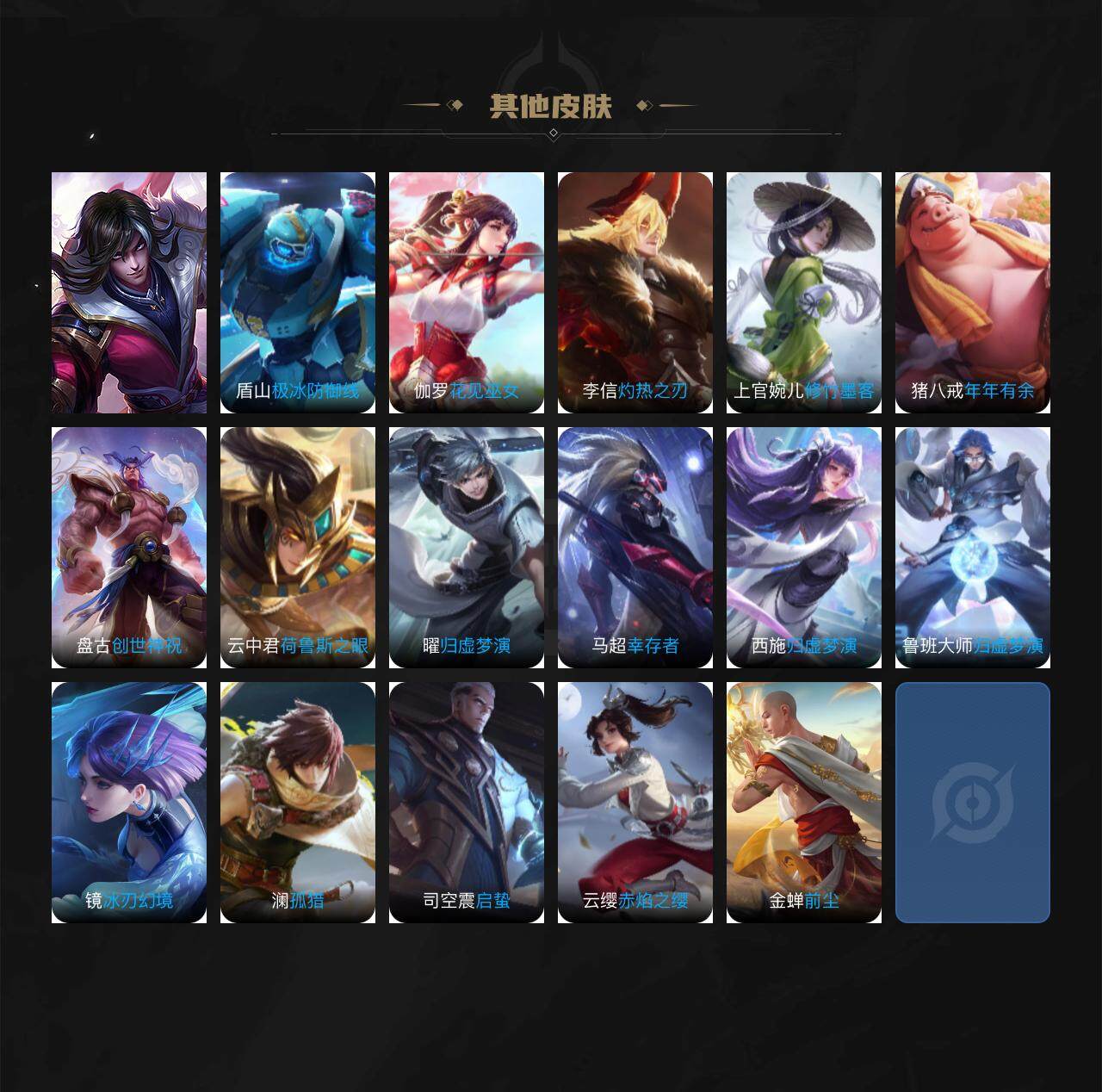【赛季限定】:狄仁杰万华元夜,老夫子醍醐杖,程咬金演武夺筹,兰陵王金庭之子,张良古海寻踪,李元芳云中旅人,钟馗驱傩正仪,鬼谷子原初探秘者,弈星混沌棋,明世隐疑决卦,裴擒虎擒涛扼浪,桑启海盐诗旅,鬼谷子天穹祈灯,刘邦剑破天穹,姜子牙天穹之誓