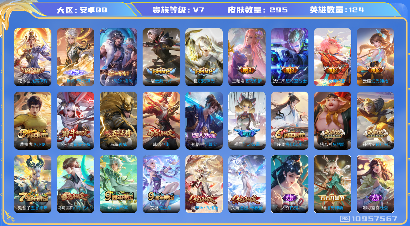 [10957567]【商品标题】:安卓Q-V7-永恒钻石II段位-124英雄-295皮肤-1典藏-0珍品无双-1无双-1珍品传说-11传说-95史诗