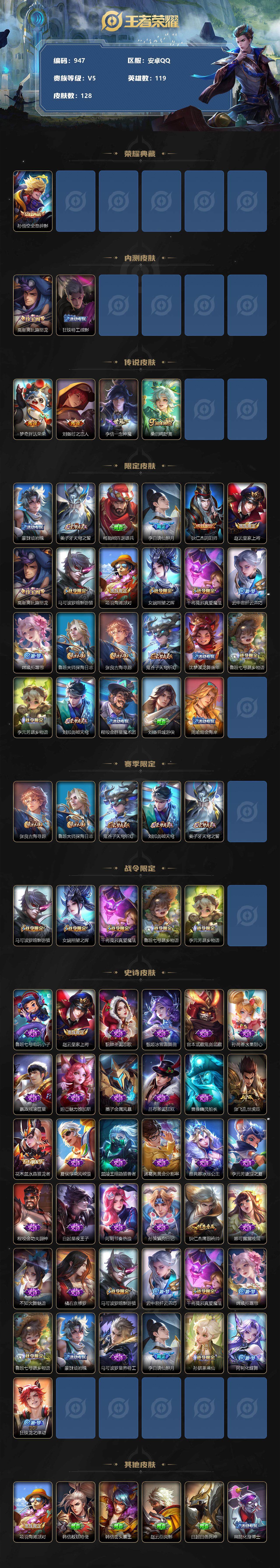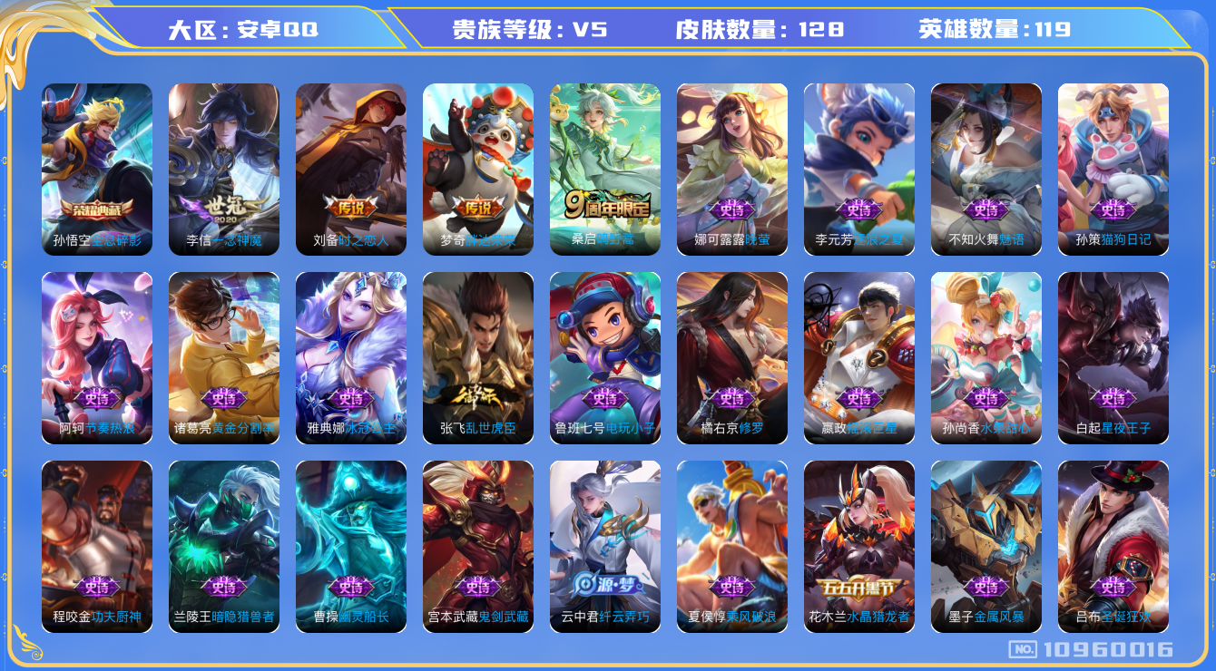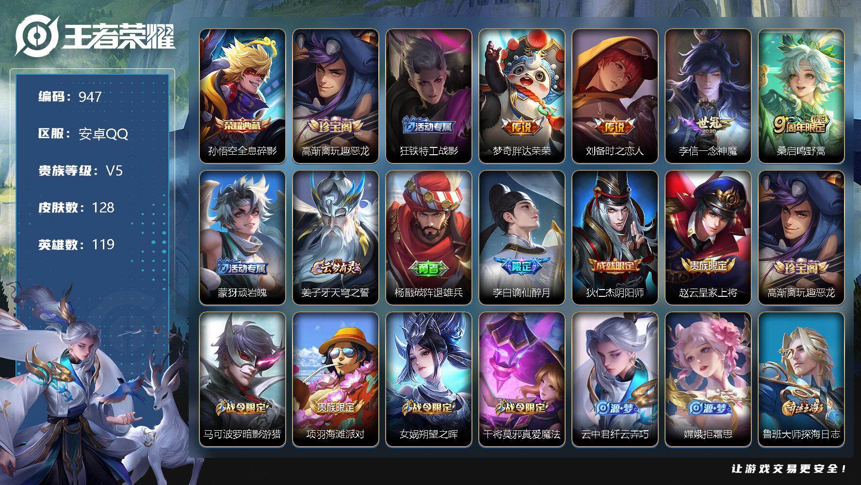 [10960016]【商品标题】:安卓Q-V5-至尊星耀I段位-119英雄-128皮肤-1典藏-0珍品无双-0无双-0珍品传说-4传说-37史诗