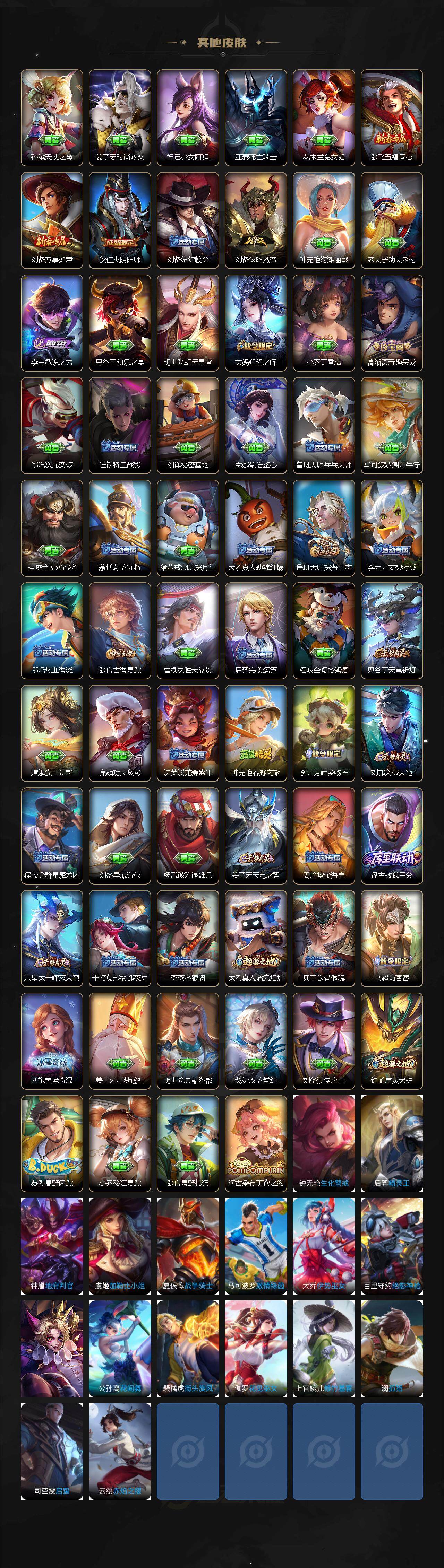 【其他皮肤】:项羽海滩派对,韩信教廷特使,韩信街头霸王,赵云忍炎影,白起白色死神,扁鹊化身博士,孙膑天使之翼,姜子牙时尚教父,妲己少女阿狸,亚瑟死亡骑士,花木兰兔女郎,张飞五福同心,刘备万事如意,狄仁杰阴阳师,刘备纽约教父,刘备汉昭烈帝,钟无艳海滩丽影,老夫子功夫老勺,李白敏锐之力,鬼谷子幻乐之宴,明世隐虹云星官,女娲朔望之晖,小乔丁香结,高渐离玩趣恶龙,哪吒次元突破,狂铁特工战影,刘禅秘密基地,露娜瓷语鉴心,鲁班大师乓乓大师,马可波罗潮玩牛仔,程咬金无双福将,蒙恬蔚蓝守将,猪八戒潮玩探月行,太乙真人劲辣红锅,鲁班大师探海日志,李元芳妄想特派,哪吒热血海滩,张良古海寻踪,曹操决胜大满贯,后羿