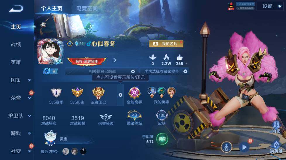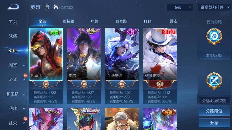 - PX_2021271-贵族等级: V8 英雄数: 121 皮肤数: 185 荣耀水晶: 九霄神辉,拾光映像 无双皮: 器灵·螭龙剑 传说皮: 久胜战神,炽阳神光,云霓雀翎,末日机甲-孙尚香,超时空战士-狄仁杰,霜月吟,澜逐花归海,琥珀纪元铠,琥珀纪元马超,乘龙·问璇玑,落雪白狼 限定皮: 祈雪灵祝,天狼绘梦者,傲雪梅枪,玉兔公主,五谷丰年,神器·万象笔,诗剑行,鸣野蒿,愿照·千秋盛