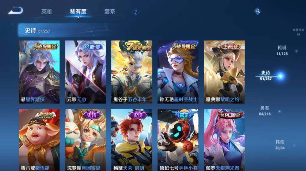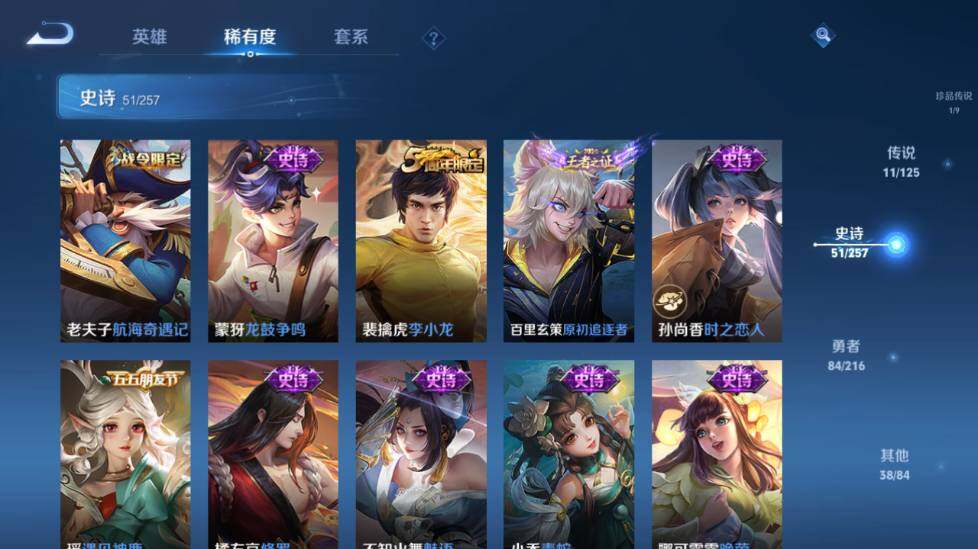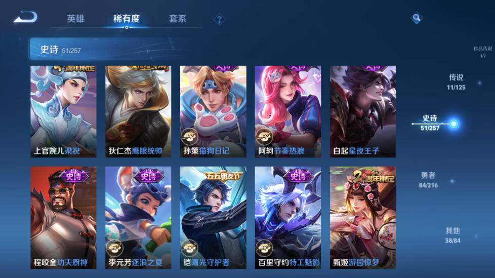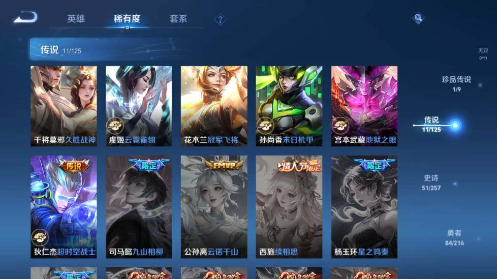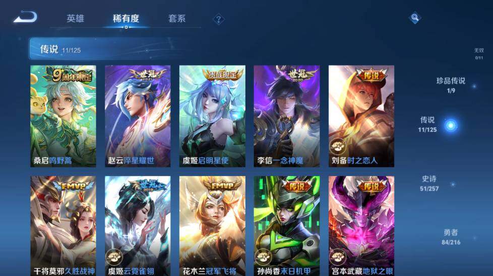 【传说皮肤】:狄仁杰超时空战士,宫本武藏地狱之眼,孙尚香末日机甲,花木兰冠军飞将,虞姬云霓雀翎,干将莫邪久胜战神,刘备时之恋人,李信一念神魔,虞姬启明星使,赵云淬星耀世,桑启鸣野蒿