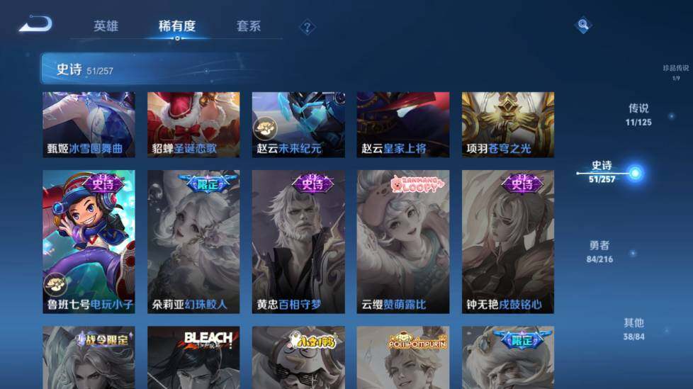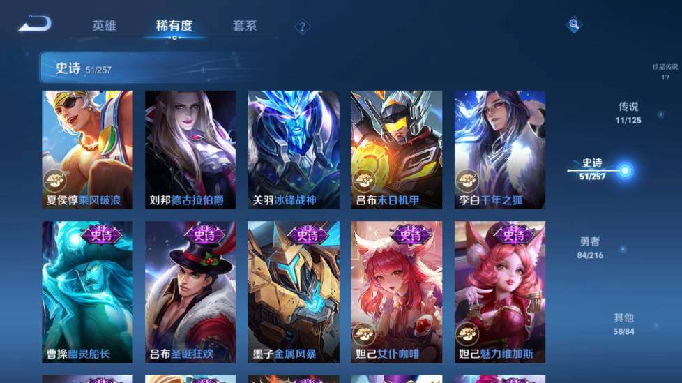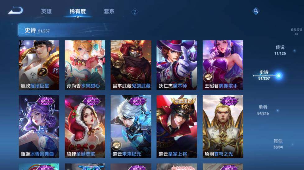 【史诗皮肤】:鲁班七号电玩小子,项羽苍穹之光,赵云皇家上将,赵云未来纪元,貂蝉圣诞恋歌,甄姬冰雪圆舞曲,王昭君偶像歌手,狄仁杰魔术师,宫本武藏鬼剑武藏,孙尚香水果甜心,嬴政摇滚巨星,妲己魅力维加斯,妲己女仆咖啡,墨子金属风暴,吕布圣诞狂欢,曹操幽灵船长,李白千年之狐,吕布末日机甲,关羽冰锋战神,刘邦德古拉伯爵,夏侯惇乘风破浪,甄姬游园惊