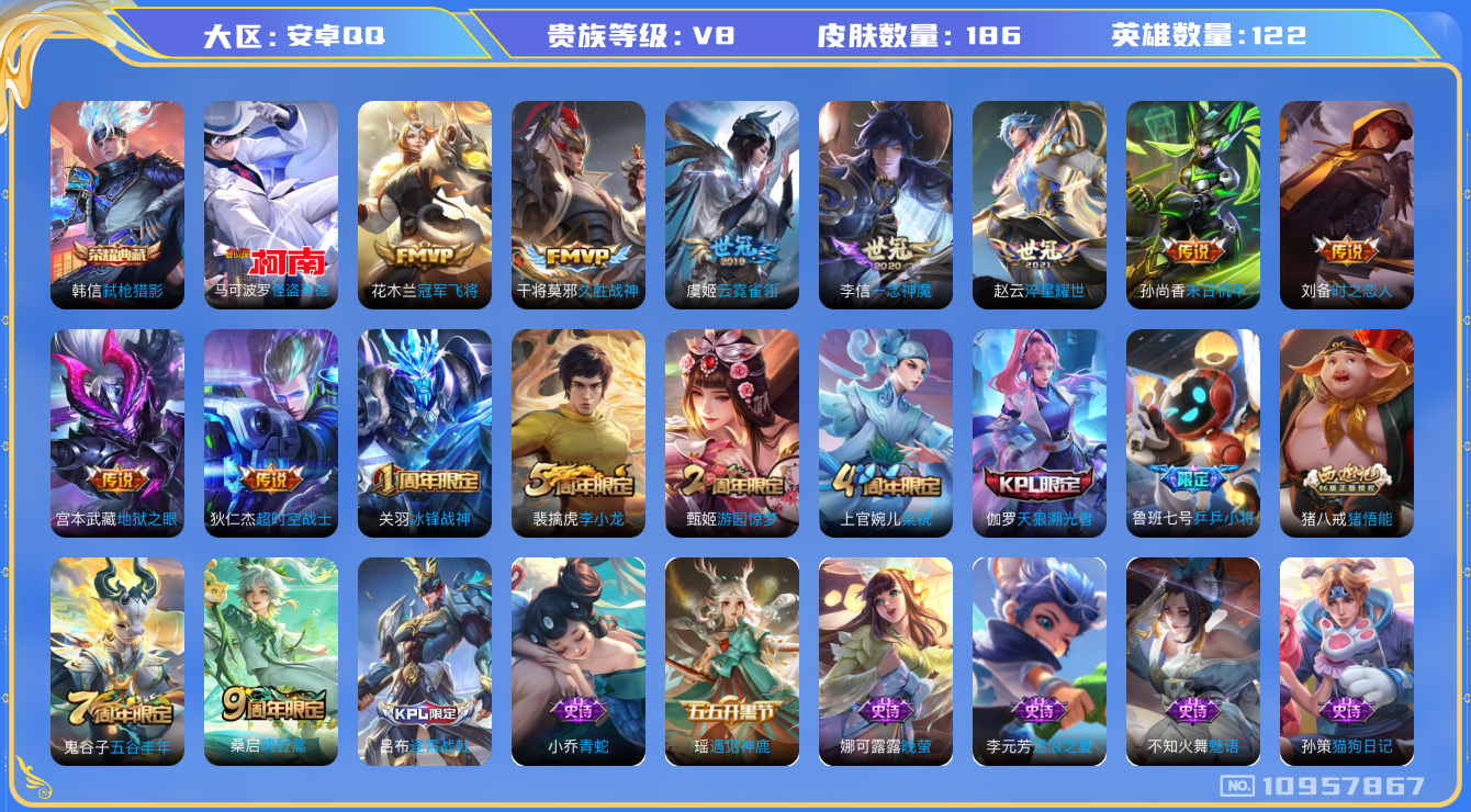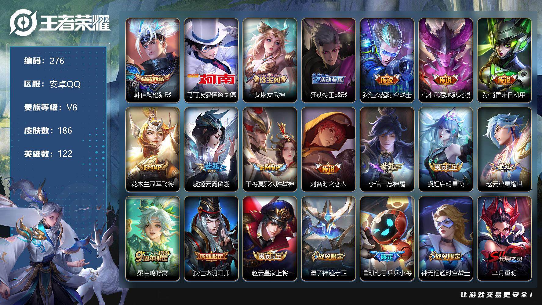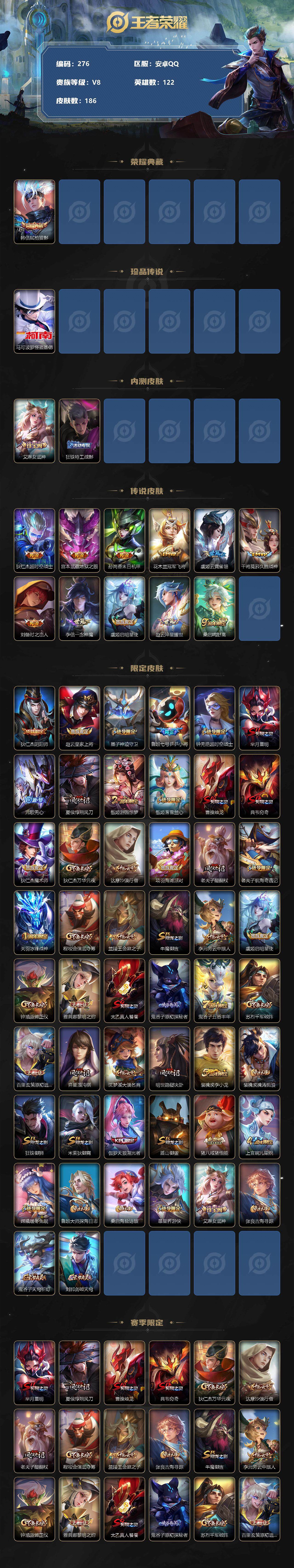 [10957867]【商品标题】:安卓Q-V8-永恒钻石I段位-122英雄-186皮肤-1典藏-0珍品无双-0无双-1珍品传说-11传说-51史诗