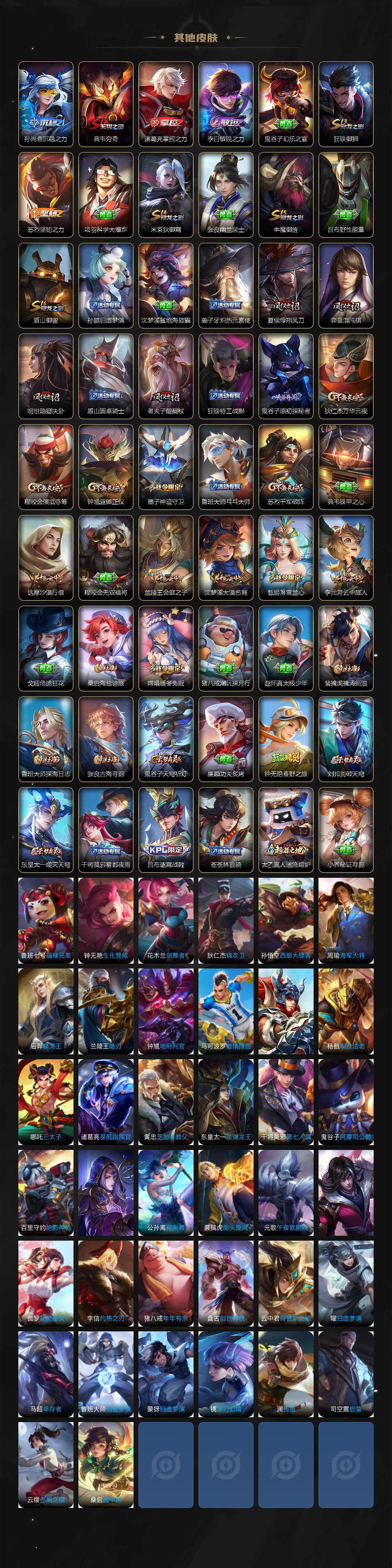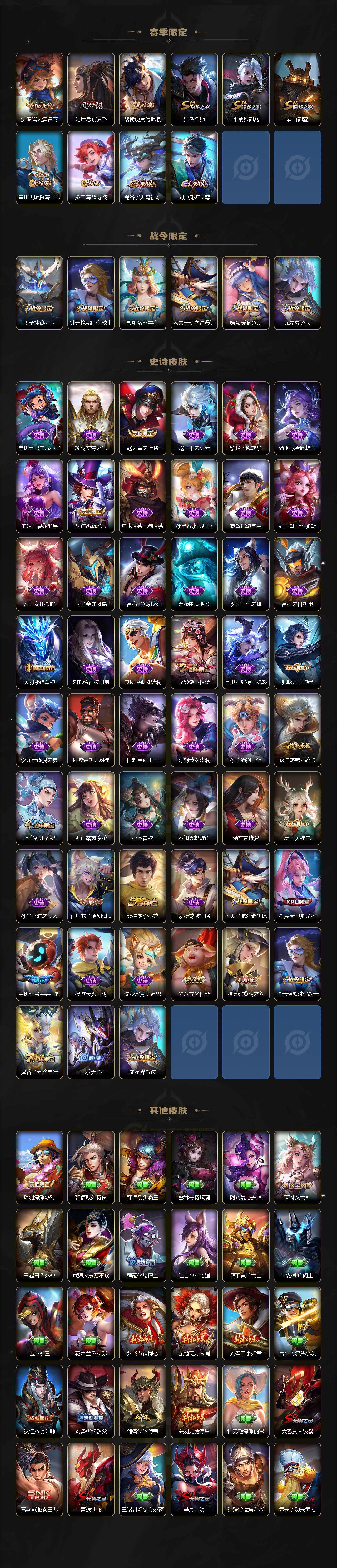 【赛季限定】:芈月重明,夏侯惇朔风刀,曹操烛龙,典韦穷奇,狄仁杰万华元夜,达摩沙漠行僧,老夫子醍醐杖,程咬金演武夺筹,兰陵王金庭之子,张良古海寻踪,牛魔御旌,李元芳云中旅人,钟馗驱傩正仪,雅典娜黎明之约,太乙真人饕餮,鬼谷子原初探秘者,苏烈千军破阵,百里玄策原初追逐者,弈星混沌棋,沈梦溪大漠名商,明世隐疑决卦,裴擒虎擒涛扼浪,狂铁御狮,米莱狄御霄,盾山御銮,鲁班大师探海日志,桑启海盐诗旅,鬼谷子天穹祈灯,刘邦剑破天穹