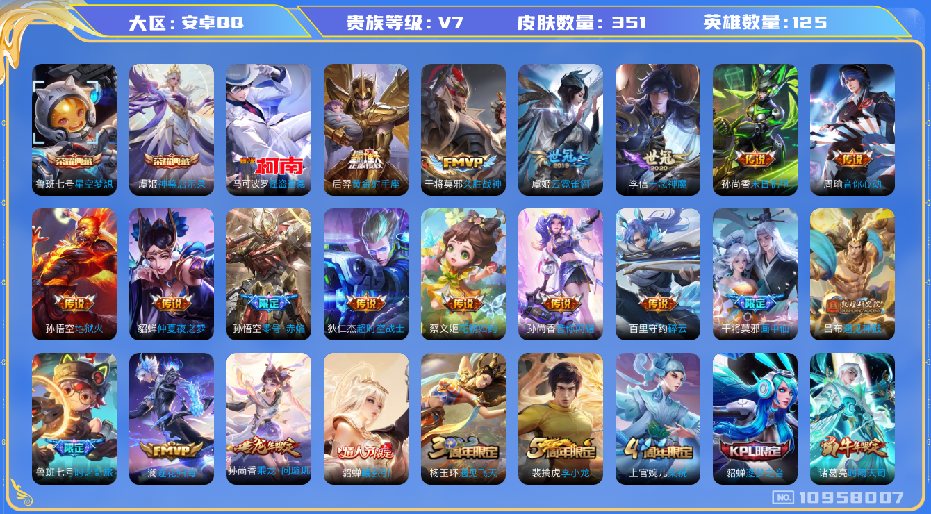 [10958007]【商品标题】:安卓Q-V7-最强王者段位-125英雄-351皮肤-2典藏-0珍品无双-0无双-1珍品传说-25传说-101史诗