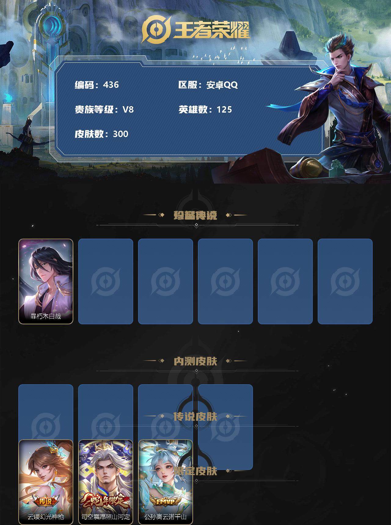 [10958217]【商品标题】:安卓Q-V8-至尊星耀III段位-125英雄-300皮肤-3典藏-0珍品无双-0无双-1珍品传说-18传说-87史诗