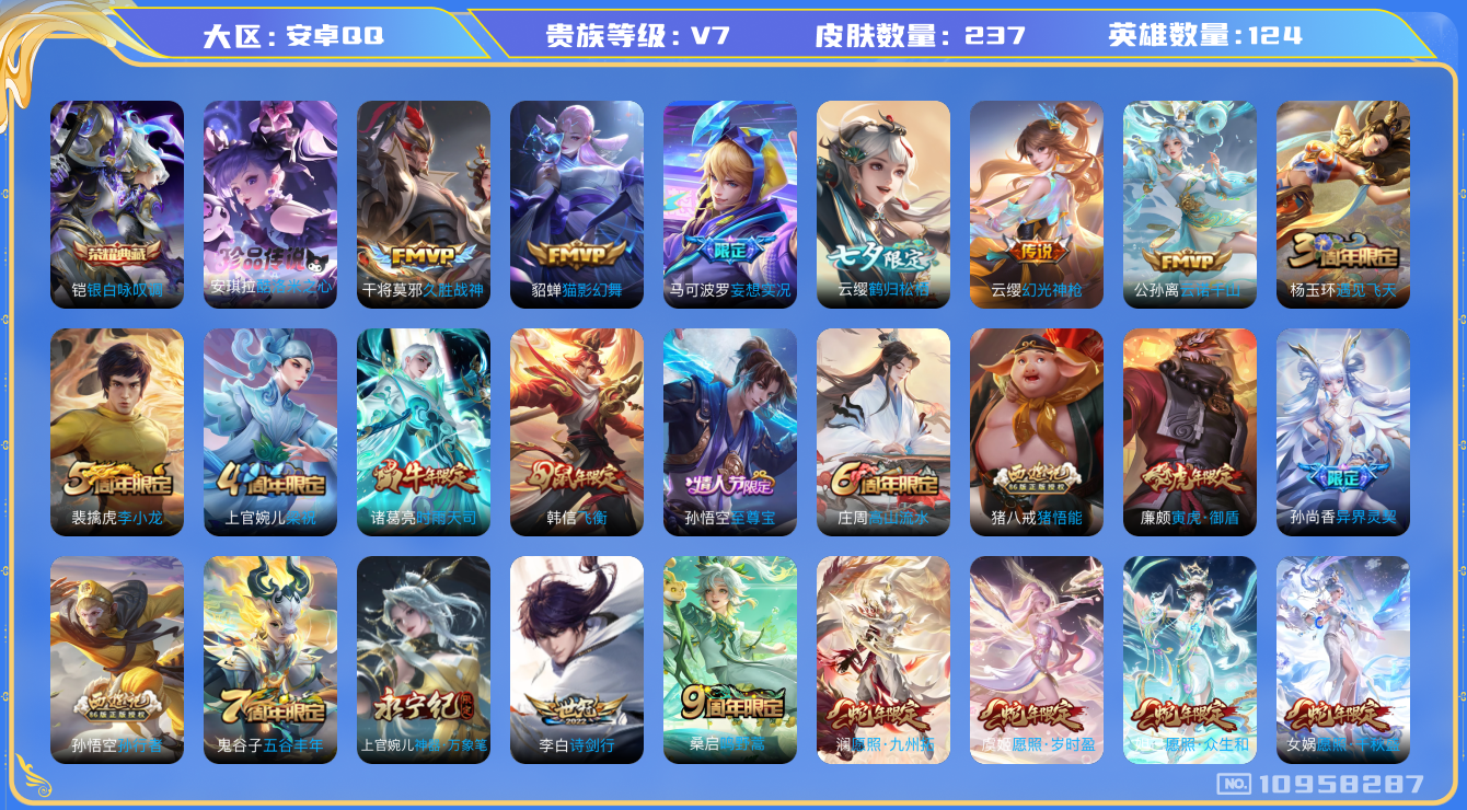 [10958287]【商品标题】:安卓Q-V7-永恒钻石III段位-124英雄-237皮肤-1典藏-0珍品无双-0无双-1珍品传说-14传说-64史诗