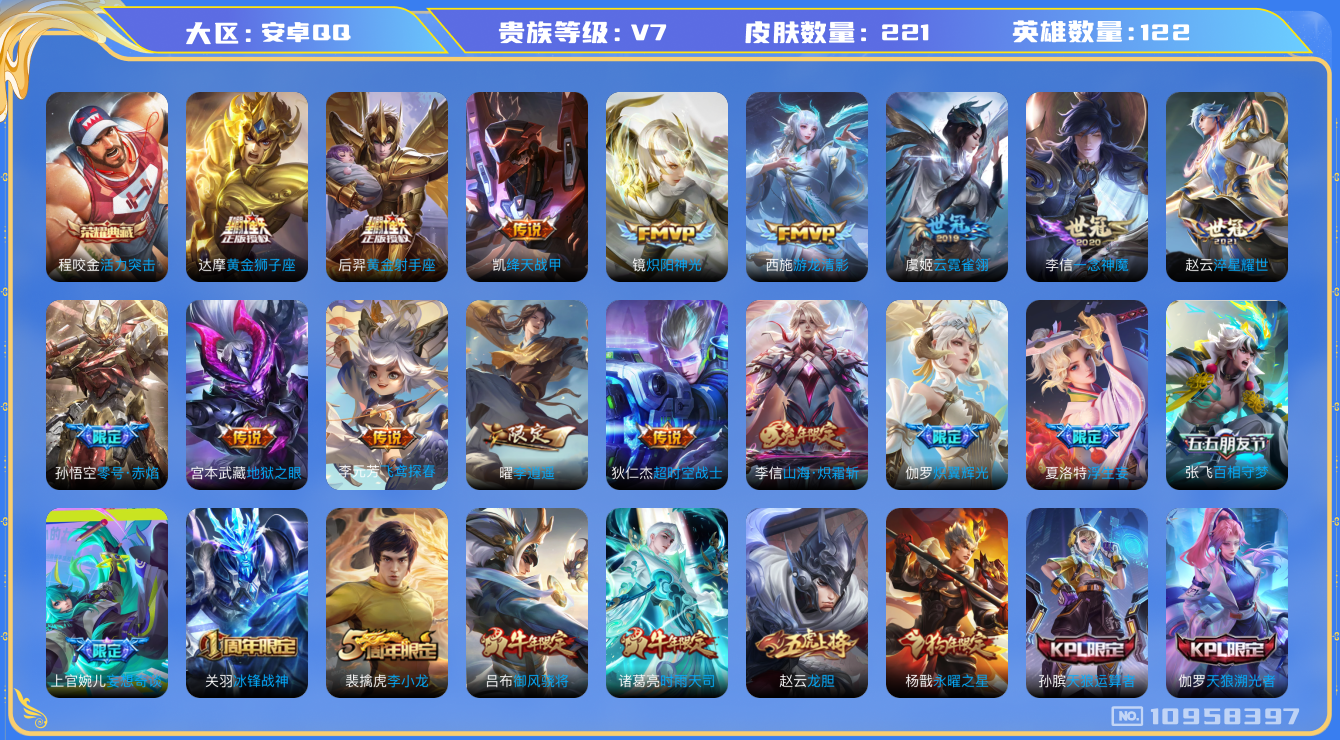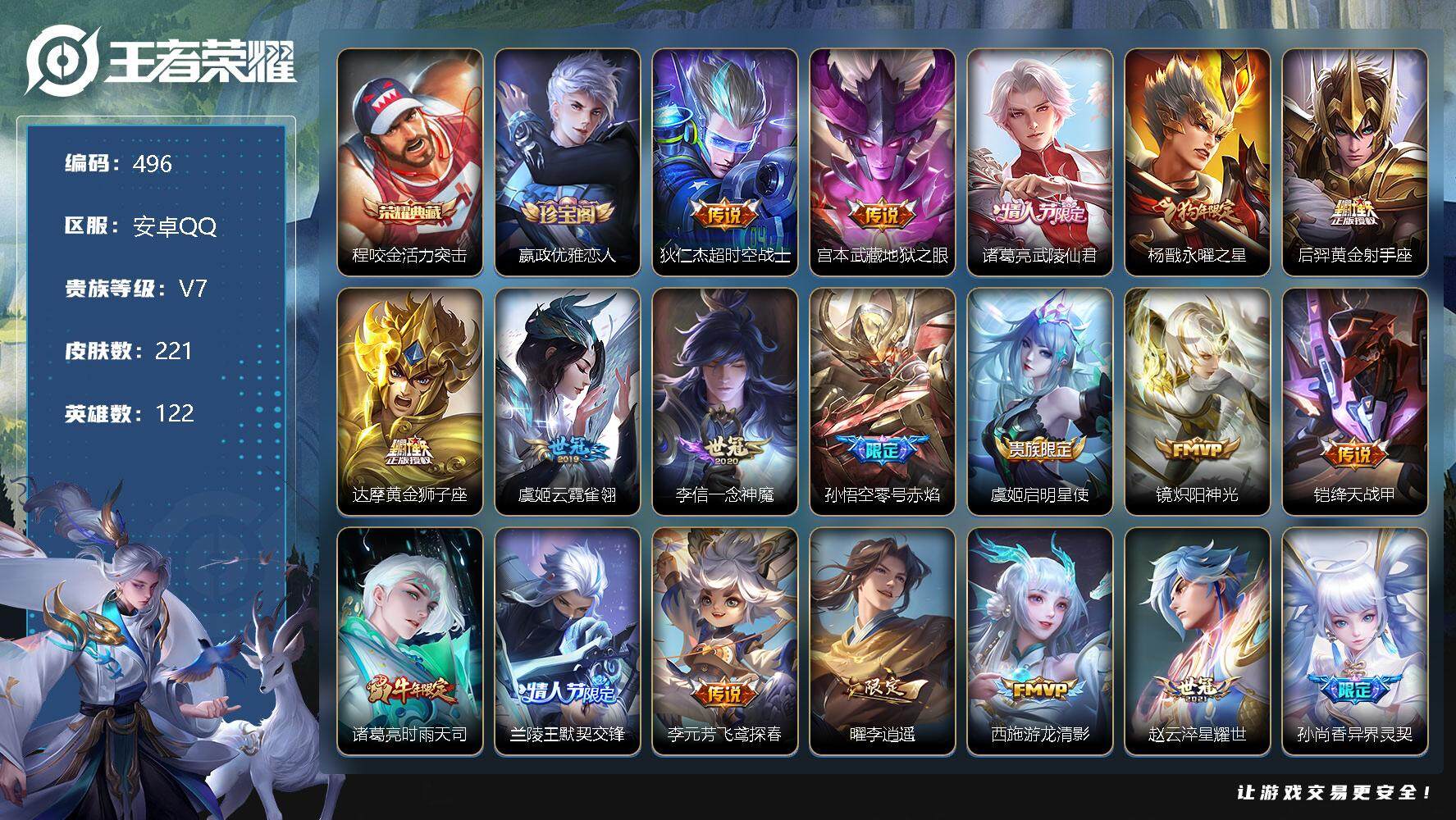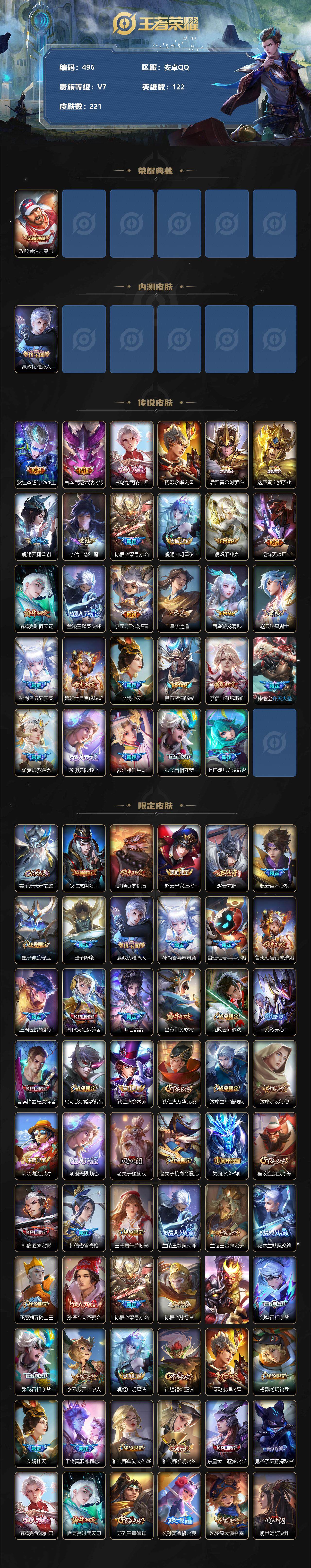 [10958397]【商品标题】:安卓Q-V7-永恒钻石II段位-122英雄-221皮肤-1典藏-0珍品无双-0无双-0珍品传说-29传说-70史诗