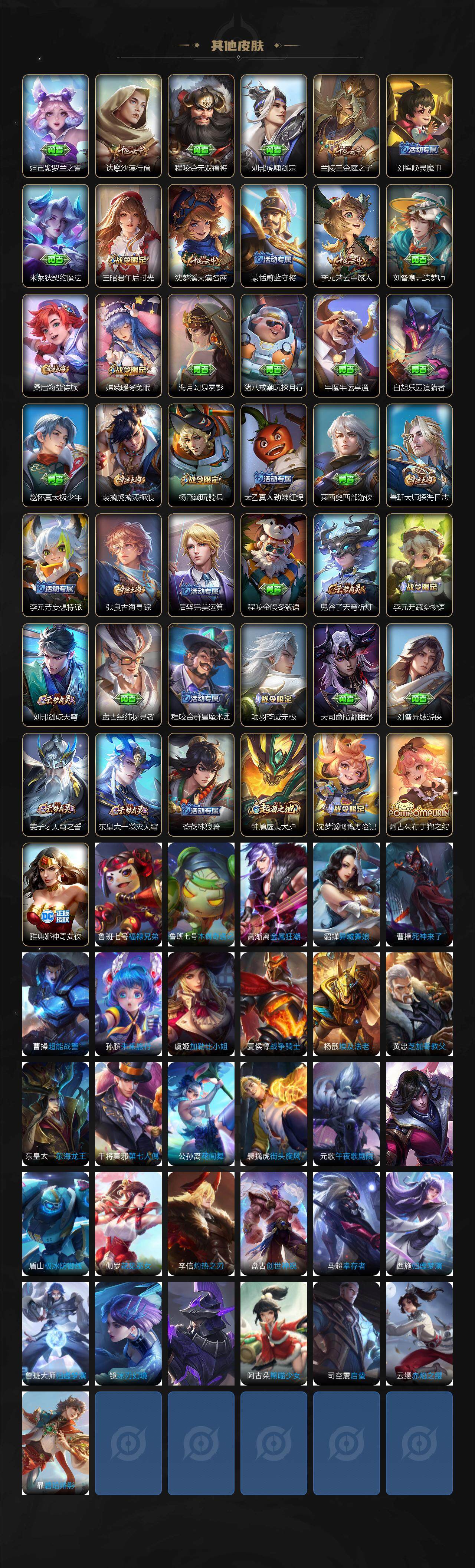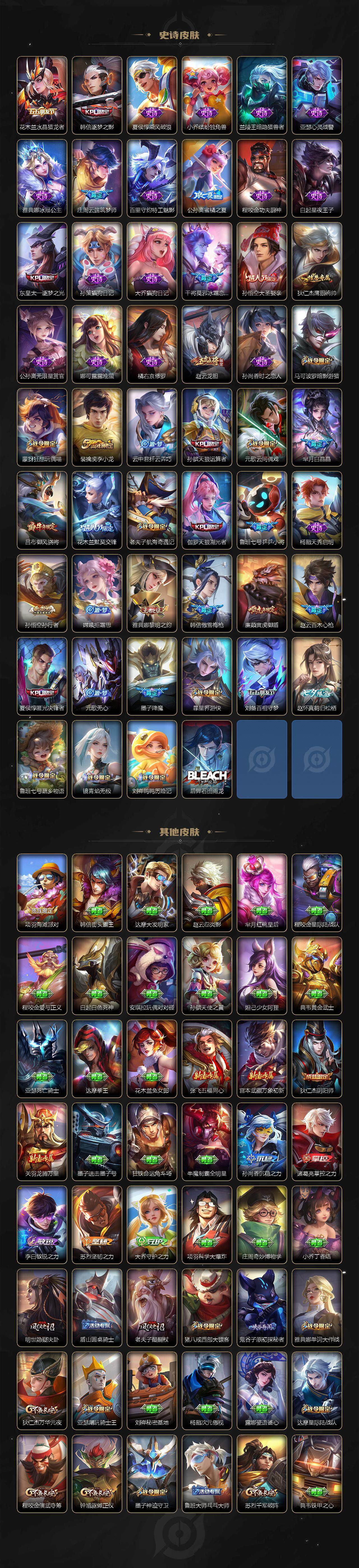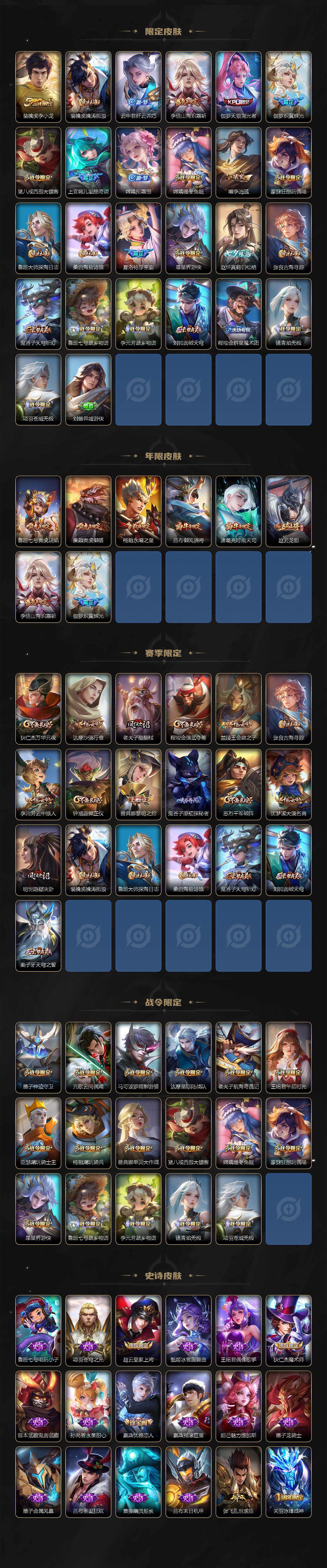 【限定皮肤】:姜子牙天穹之誓,狄仁杰阴阳师,廉颇寅虎御盾,赵云皇家上将,赵云龙胆,赵云百木心枪,墨子神迹守卫,墨子降魔,嬴政优雅恋人,孙尚香异界灵契,鲁班七号乒乒小将,鲁班七号寅虎瑞焰,庄周云端筑梦师,孙膑天狼运算者,芈月白晶晶,吕布御风骁将,元歌云间偶戏,元歌无心,夏侯惇匿光决锋者,马可波罗暗影游猎,狄仁杰魔术师,狄仁杰万华元夜,达摩星际陆战队,达摩沙漠行僧,项羽海滩派对,项羽无限倾心,老夫子醍醐杖,老夫子航海奇遇记,关羽冰锋战神,程咬金演武夺筹,韩信逐梦之影,韩信傲雪梅枪,王昭君午后时光,兰陵王默契交锋,兰陵王金庭之子,花木兰默契交锋,亚瑟潮玩骑士王,孙悟空大圣娶亲,孙悟空零号赤焰,孙悟空孙行者,孙悟空齐天大圣,刘备百相守梦,张飞百相守梦,李元芳云中旅人,虞姬启明星使,钟馗驱傩正仪,杨戬永曜之星,杨戬潮玩骑兵,女娲补天,干将莫邪冰霜恋舞曲,雅典娜单词大作战,雅典娜黎明之约,东皇太一逐梦之光,鬼谷子原初探秘者,诸葛亮武陵仙君,诸葛亮时雨天司,苏烈千军破阵,公孙离蜜橘之夏,沈梦溪大漠名商,明世隐疑决卦,裴擒虎李小龙,裴擒虎擒涛扼浪,云中君纤云弄巧,李信山海炽霜斩,伽罗天狼溯光者,伽罗炽翼辉光,猪八戒西部大镖客,上官婉儿妄想奇谈,嫦娥拒霜思,嫦娥暖冬兔眠,曜李逍遥 ,蒙犽狂想玩偶喵,鲁班大师探海日志,桑启海盐诗旅,夏洛特浮生妄,暃星界游侠,赵怀真鹤归松栖,张良古海寻踪,鬼谷子天穹祈灯,鲁班七号蔬乡物语,李元芳蔬乡物语,刘邦剑破天穹,程咬金群星魔术团,镜青焰无极,项羽苍威无极,刘备异域游侠