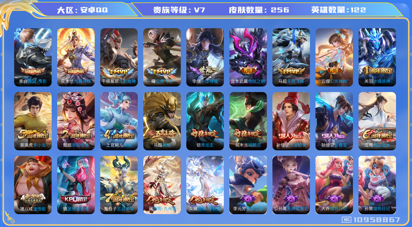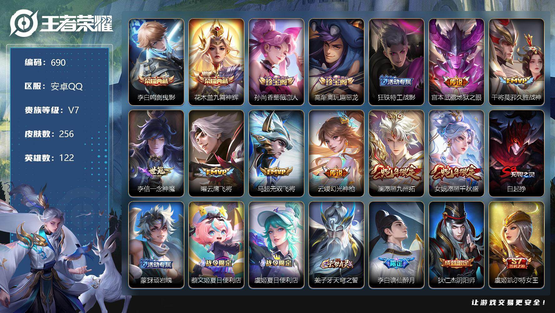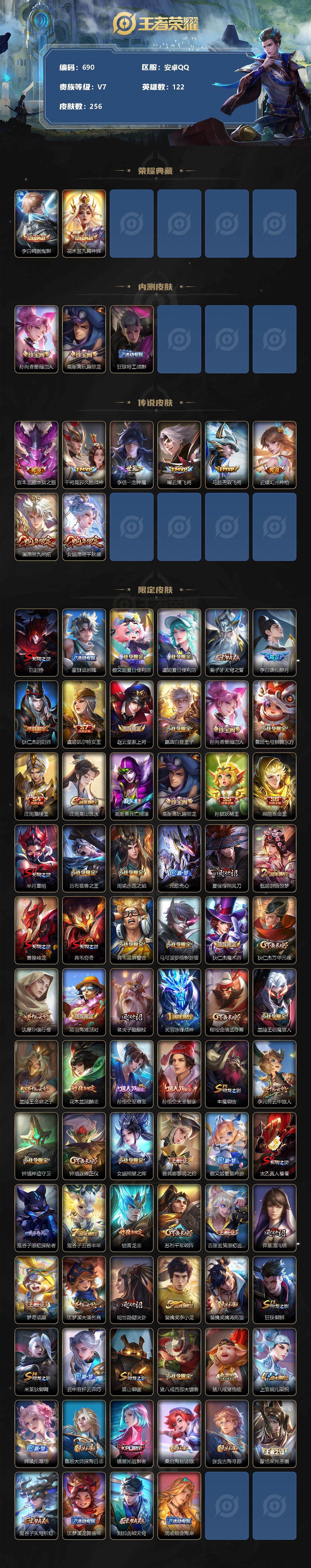 [10958867]【商品标题】:安卓Q-V7-最强王者段位-122英雄-256皮肤-2典藏-0珍品无双-0无双-0珍品传说-8传说-75史诗