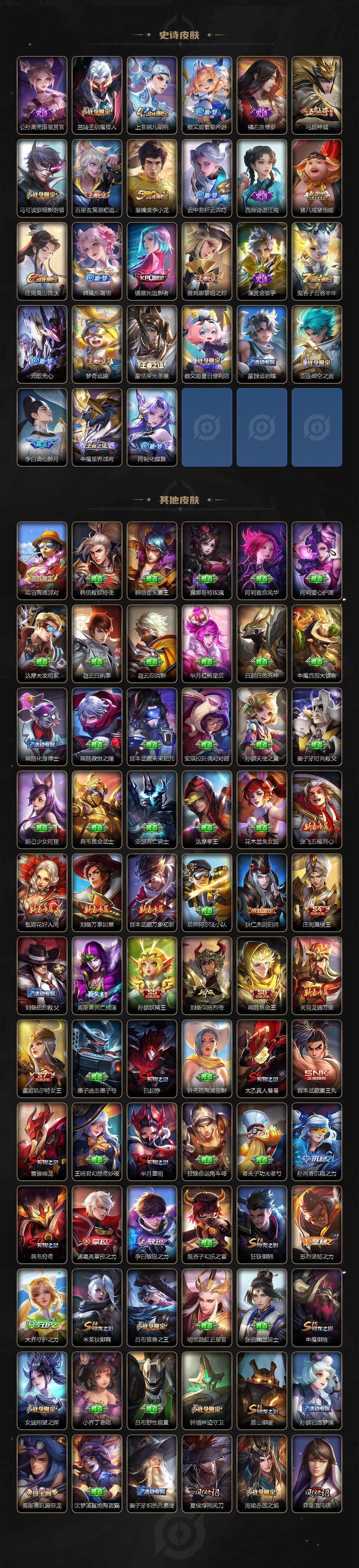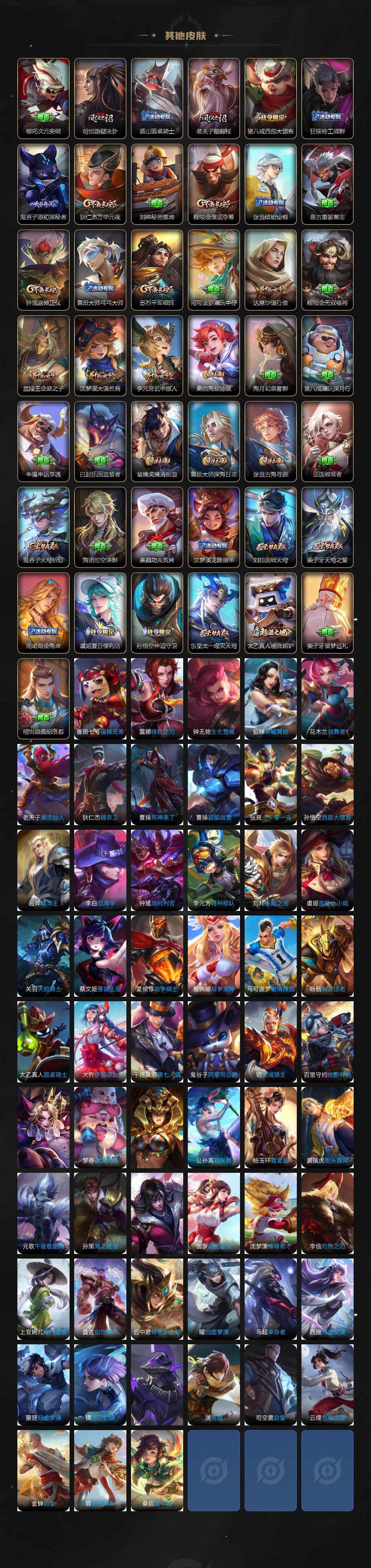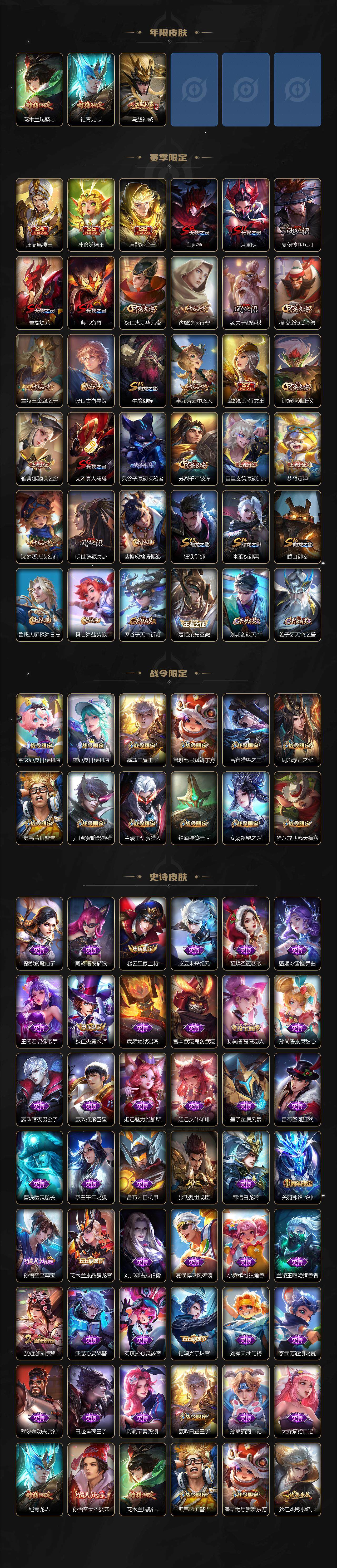 【限定皮肤】:白起狰,蒙犽顽岩魄,蔡文姬夏日便利店,虞姬夏日便利店,姜子牙天穹之誓,李白谪仙醉月,狄仁杰阴阳师,虞姬凯尔特女王,赵云皇家上将,嬴政白昼王子,孙尚香蔷薇恋人,鲁班七号狮舞东方,庄周蜃楼王,庄周高山流水,高渐离死亡摇滚,高渐离玩趣恶龙,孙膑妖精王,扁鹊炼金王,芈月重明,吕布猎兽之王,周瑜赤莲之焰,元歌无心,夏侯惇朔风刀,甄姬游园惊梦,曹操烛龙,典韦穷奇,典韦蓝屏警告,马可波罗暗影游猎,狄仁杰魔术师,狄仁杰万华元夜,达摩沙漠行僧,项羽海滩派对,老夫子醍醐杖,关羽冰锋战神,程咬金演武夺筹,兰陵王驯魔猎人,兰陵王金庭之子,花木兰瑞麟志,孙悟空至尊宝,孙悟空大圣娶亲,牛魔御旌,李元芳云中旅人,钟馗神迹守卫,钟馗驱傩正仪,女娲朔望之晖,雅典娜黎明之约,蔡文姬繁星吟游,太乙真人饕餮,鬼谷子原初探秘者,鬼谷子五谷丰年,铠青龙志,苏烈千军破阵,百里玄策原初追逐者,弈星混沌棋,梦奇顽趣,沈梦溪大漠名商,明世隐疑决卦,裴擒虎李小龙,裴擒虎擒涛扼浪,狂铁御狮,米莱狄御霄,云中君纤云弄巧,盾山御銮,猪八戒西部大镖客,猪八戒猪悟能,上官婉儿梁祝,嫦娥拒霜思,鲁班大师探海日志,镜匿光追影者,桑启海盐诗旅,张良古海寻踪,蒙恬荣光圣徽,鬼谷子天穹祈灯,沈梦溪龙舞盛年,刘邦剑破天穹,周瑜熔金海岸