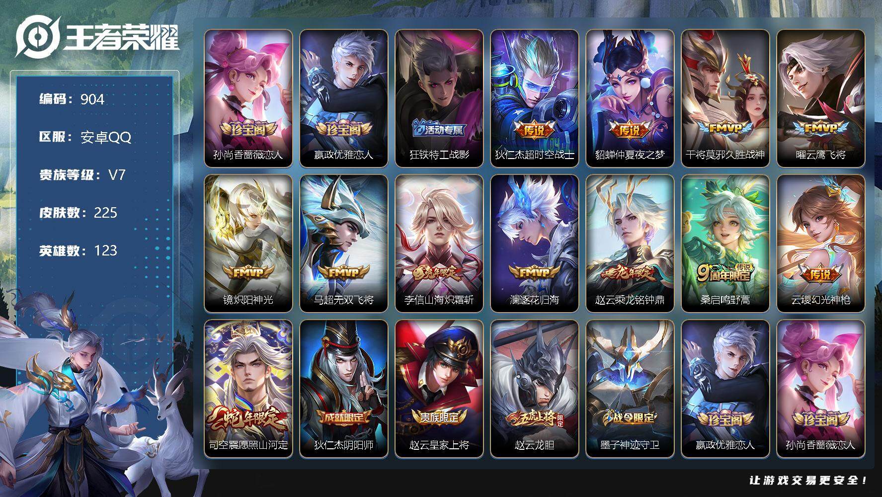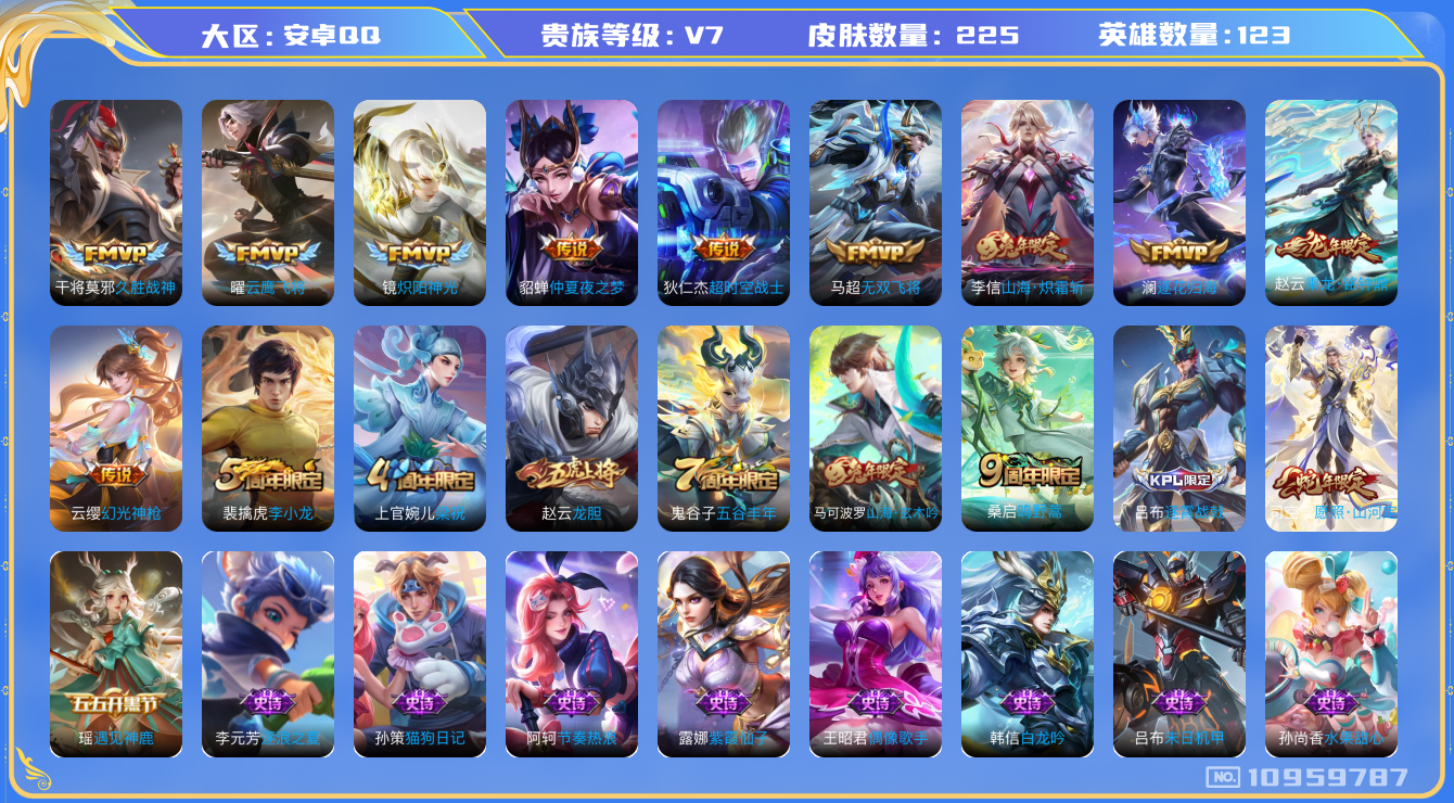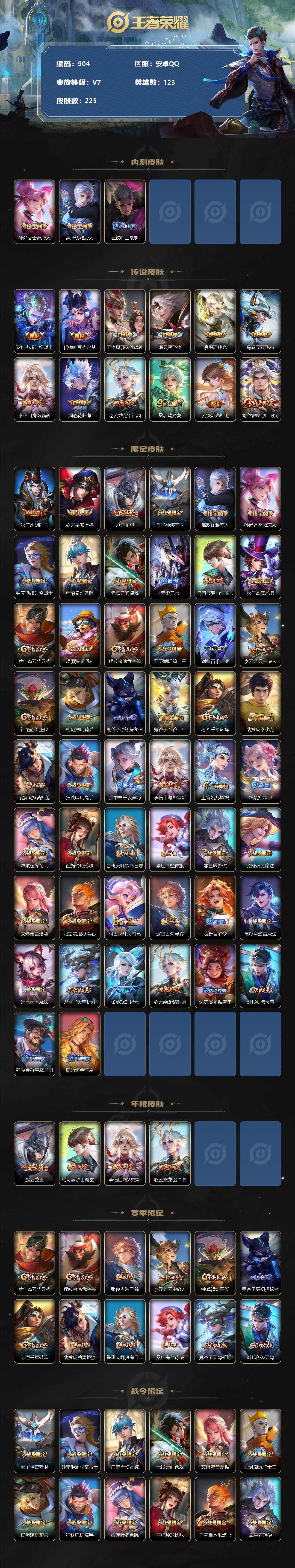 [10959787]【商品标题】:安卓Q-V3-永恒钻石II段位-123英雄-225皮肤-0典藏-0珍品无双-0无双-0珍品传说-12传说-52史诗